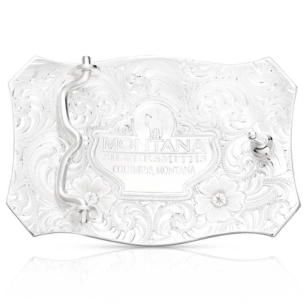 Tap into the Wild West with the Lone Star Legacy Buckle. This buckle features floral silver tone engravings on the surface of the buckle and four gold tone stars adorn each corner. A large, detailed longhorn sits in the center of the buckle to round out the look. This buckle has a 1.5 inch back swivel.