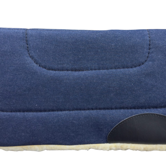 Crafted for lasting performance, this Navy Denim Pony Saddle Pad features a durable blue denim top paired with a soft maize fleece bottom for comfort. Black wear leathers enhance durability in high-contact areas, while a felt center provides added cushioning. Designed to protect your pony and ensure a secure fit, this saddle pad combines strength and comfort for reliable use.