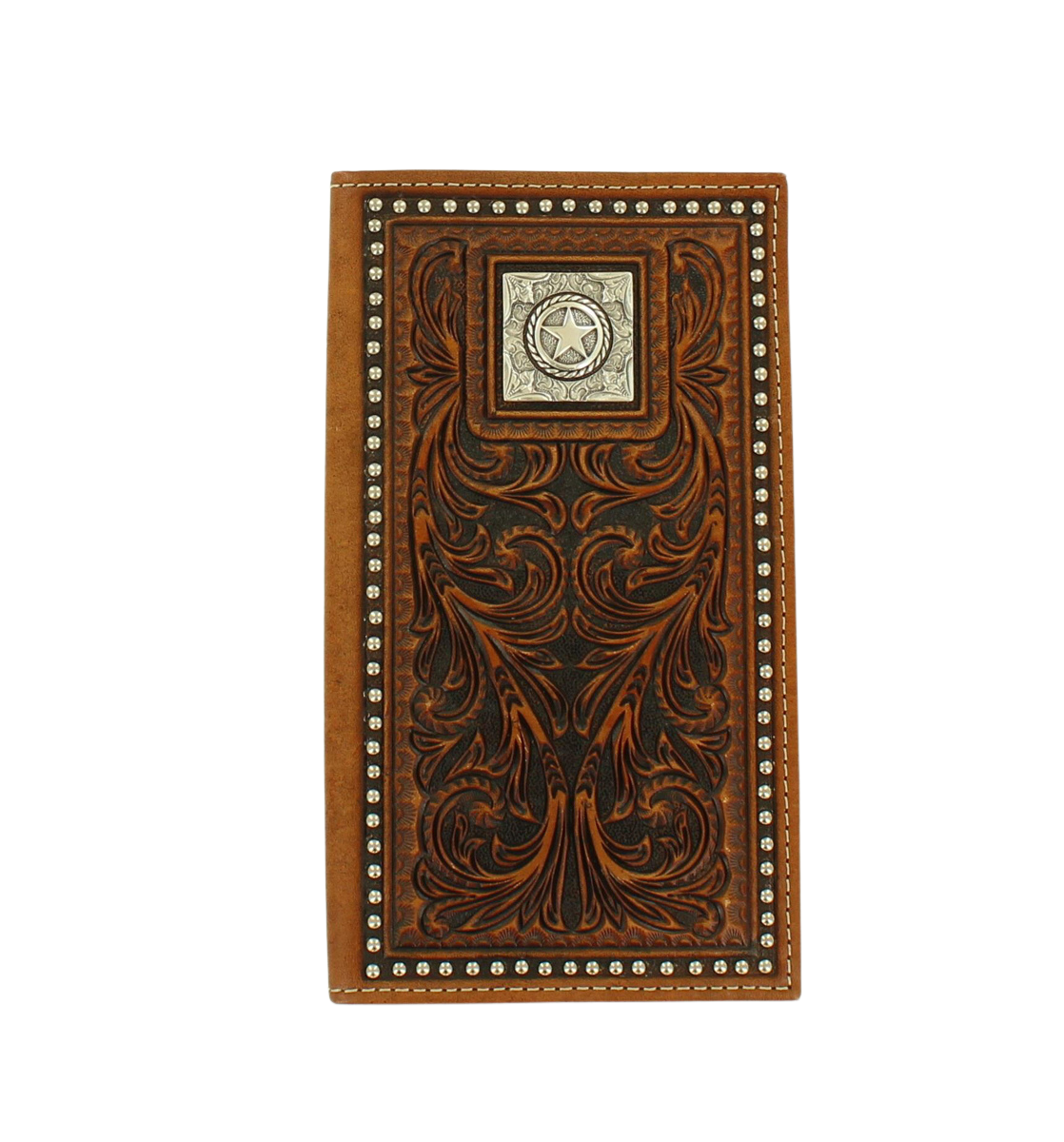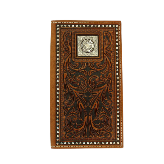 This Nocona rodeo wallet by M&F Western Products® features hand tooled western embossing with decorative nailhead trim and silver concho with star inset. Inside features multiple compartments for your credit cards, cash, and an ID window.