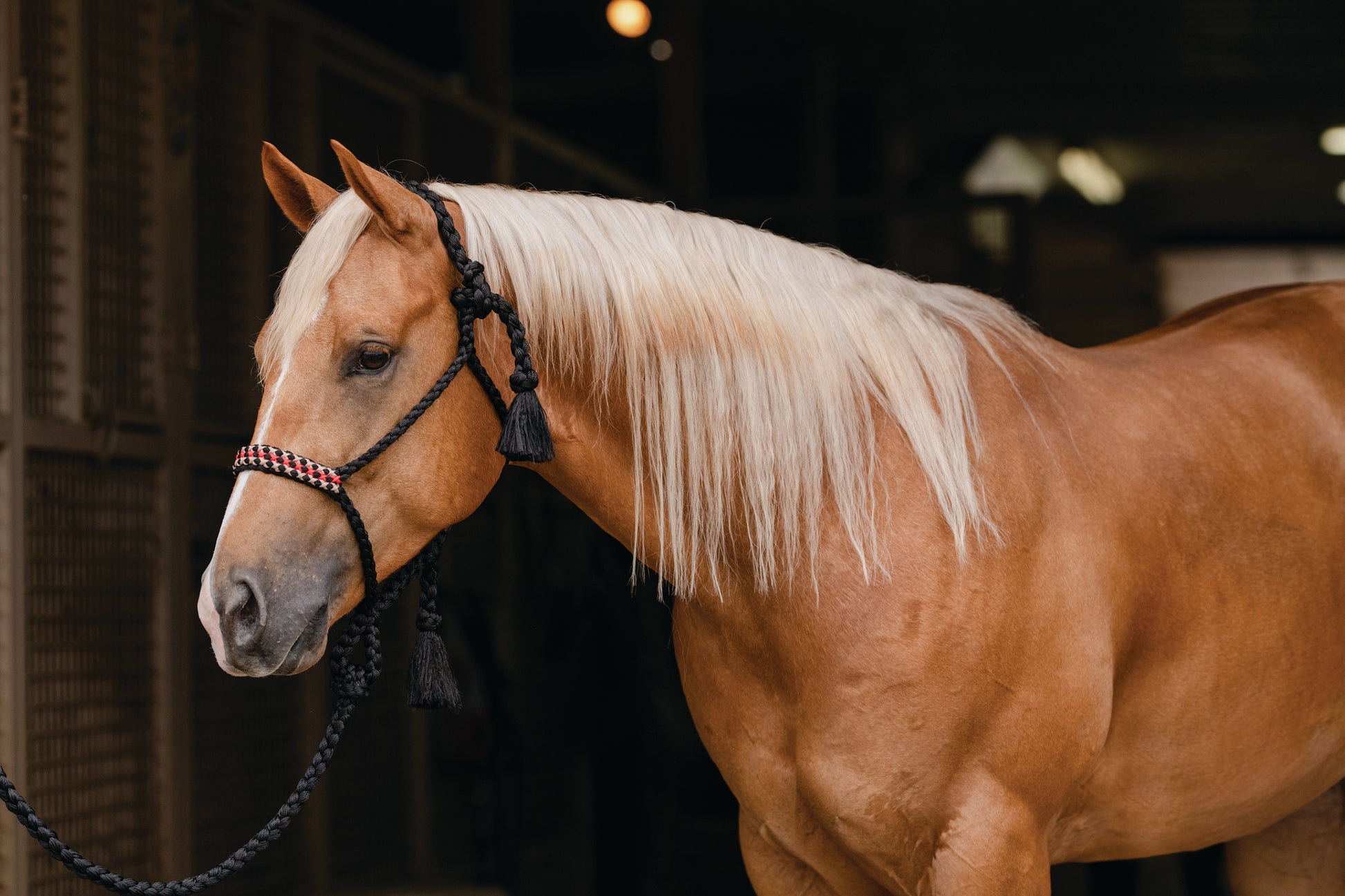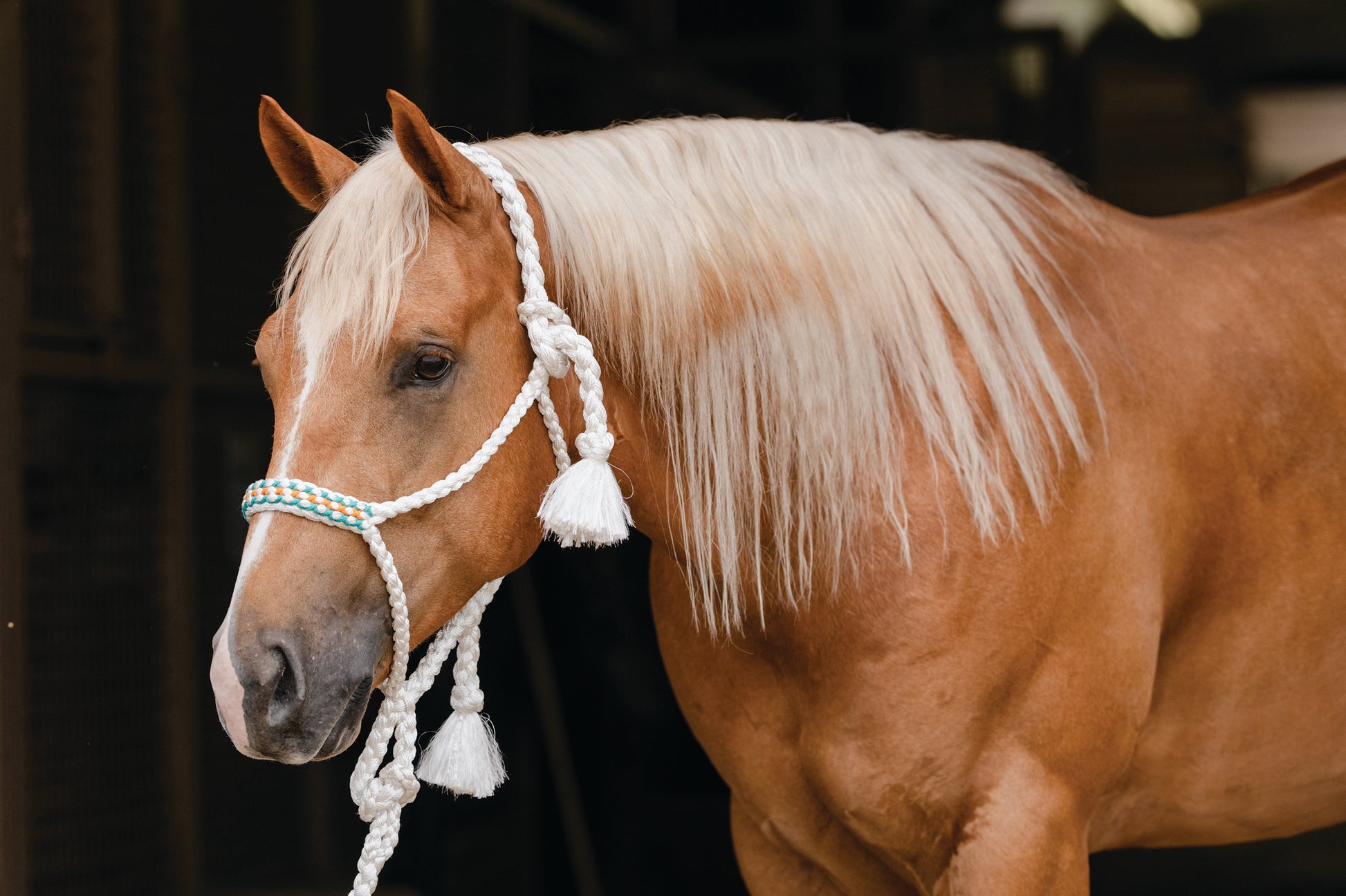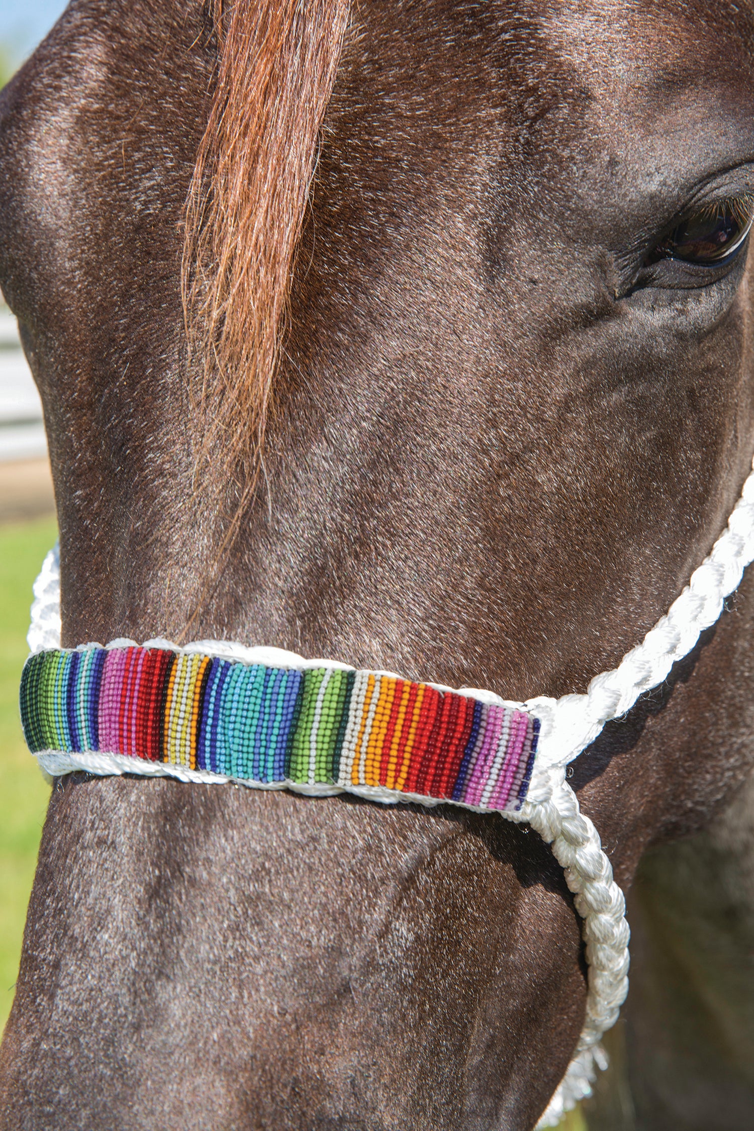 A braided soft yet sturdy rope halter that features a flat nose with colorful woven design and comes complete with a matching ten foot lead.