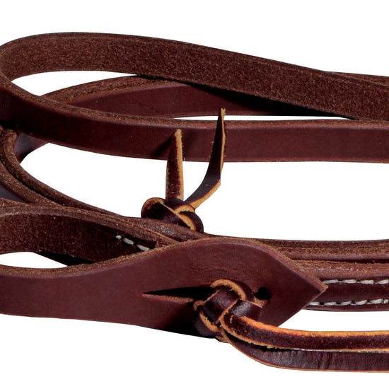 Ranch Collection harness leather roping reins have a scalloped quick-change pineapple knot loop and a unique heavy oil dressing that gives a great feel right out of the box. Nickel plated bolt snaps.