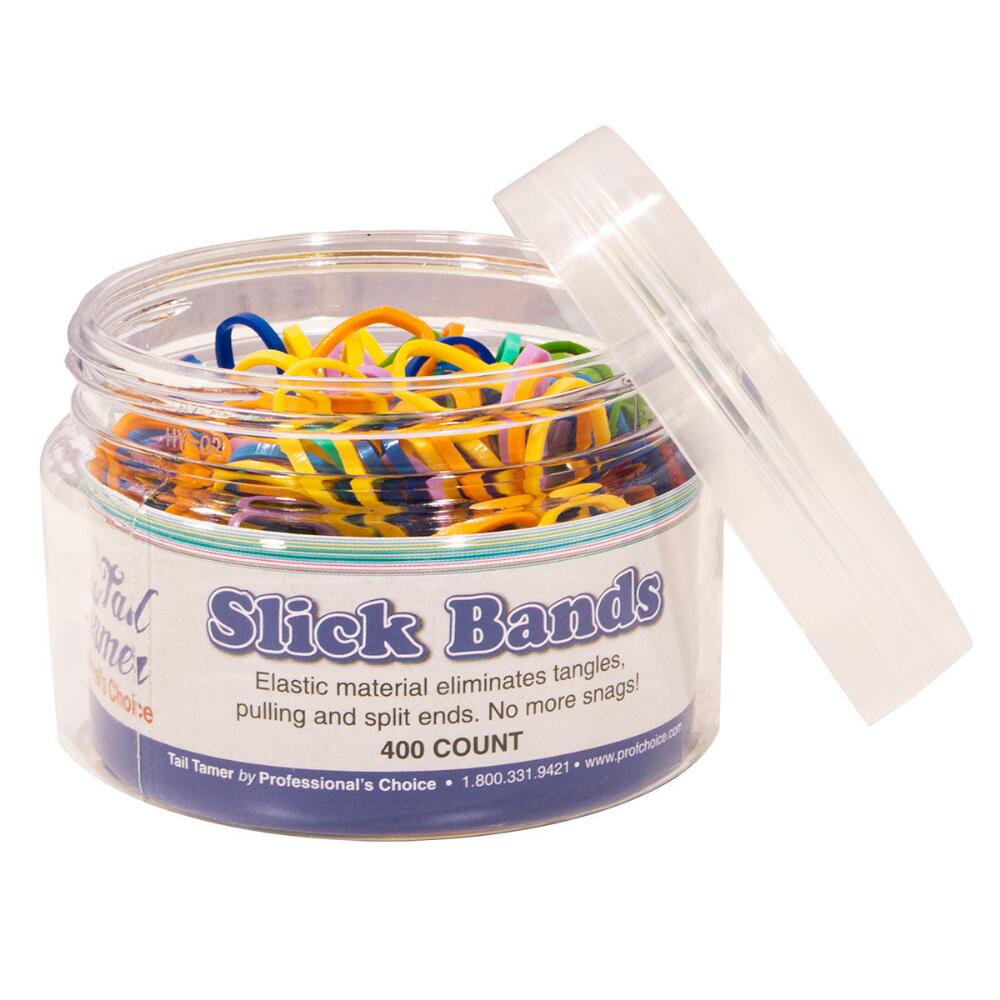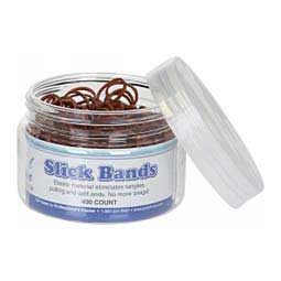Slick bands have a new elastic material that eliminates tangles, pulling, and broken ends. It's the choice of salon pros and is now available for your horse! Handy resealable bag of 400 bands. Unlike rubber bands, which break down with age and sunlight, Slick Bands won't dry out.