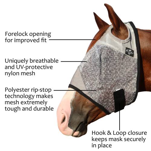 This heavy-duty fly mask is made of UV-protective nylon mesh to provide maximum protection against flies and other biting insects. To ensure comfort, the mask is designed with an especially smooth and breathable mesh around the ears and poll. The material is lightweight, stain resistant and breathable, while the polyester rip-stop technology makes it extremely durable. Strategically placed darts and lightweight design keep the mask off the eyes with no obstruction of vision. Hook and loop closure keeps the mask securely in place.