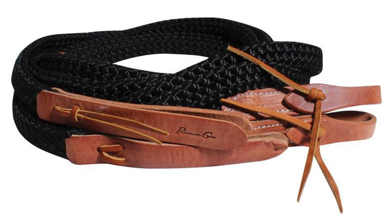9' rein (including popper) with waterloops at bit end for better response. Tail end poppers and waterloops made from harness leather. Made in the USA.