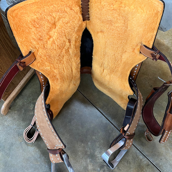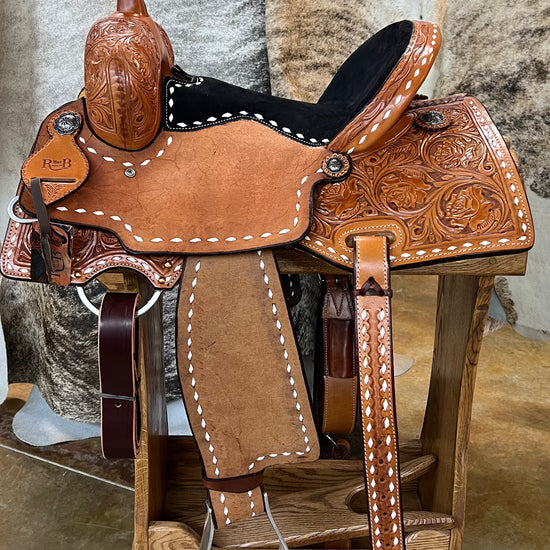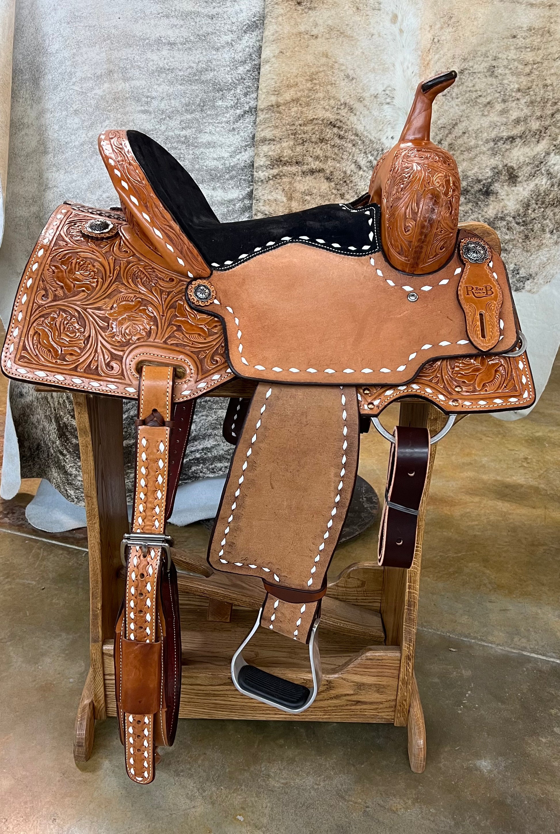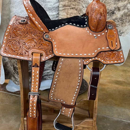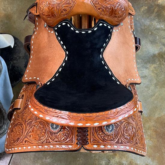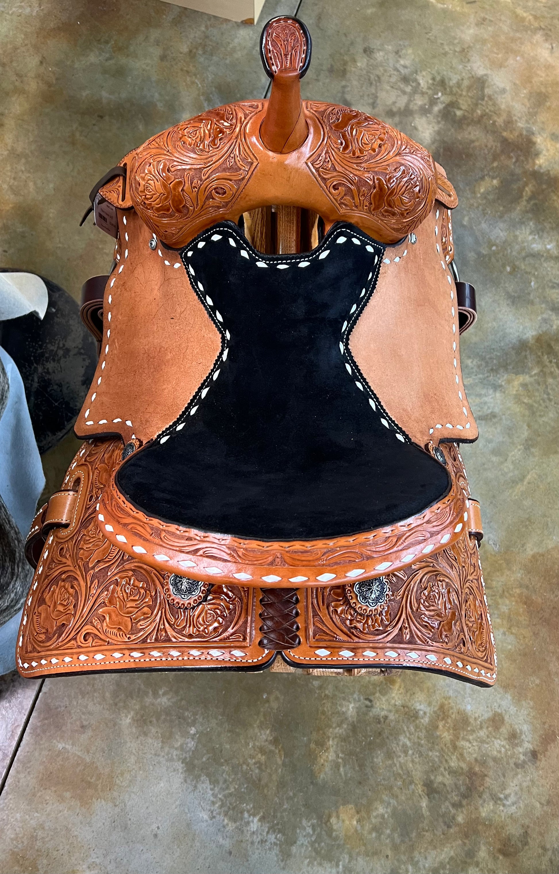 1/2 Tool Rose Floral, Roughout Jockey and Fender, White Buckstitching throughout, Black Suede Seat, Matching Flank Set.