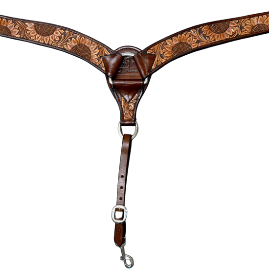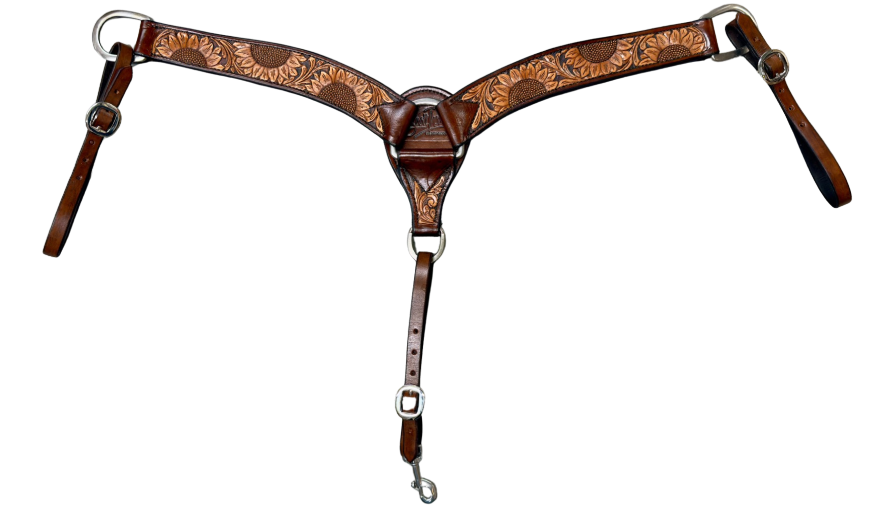 This Scott Thomas breast collar combines timeless Western style with functional durability. Hand-tooled sunflower details adorn supple leather, creating an eye-catching focal point for any horse's tack setup. The vintage finish adds authentic character and charm, while heavy-duty stainless steel hardware ensures long-lasting performance in any weather. Perfect for riders who appreciate craftsmanship and distinctive design that stands out in the arena or on the trail.