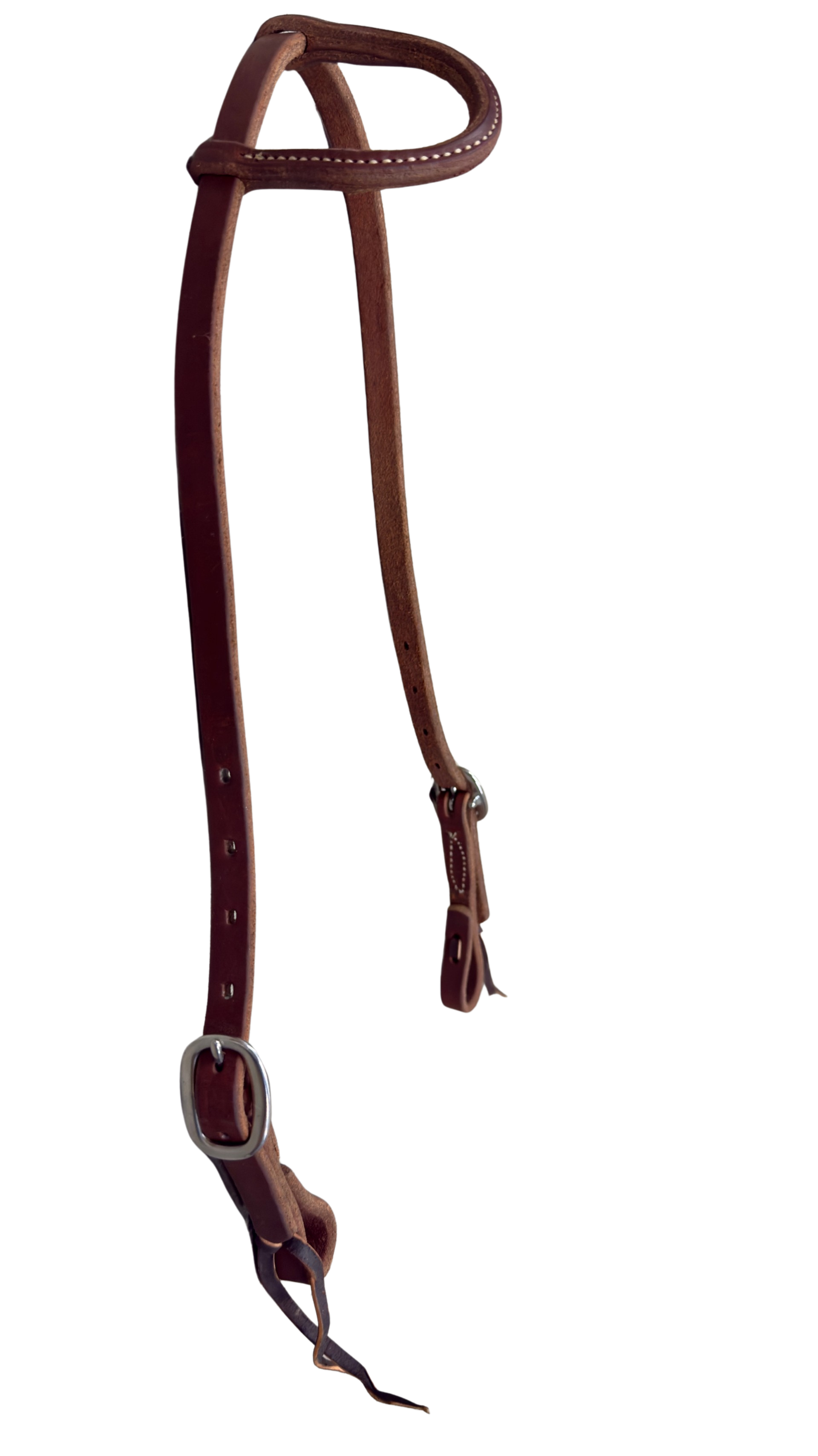 Built from heavy oiled harness leather, the R Bar B 5/8" Sliding Ear Headstall offers exceptional strength and long-lasting wear. Equipped with stainless steel buckles for secure fitment, it features tie bit ends for quick, hassle-free bit changes. The sliding one-ear design enhances adjustability and comfort, making this headstall a reliable and versatile choice for riders who demand both functionality and style.