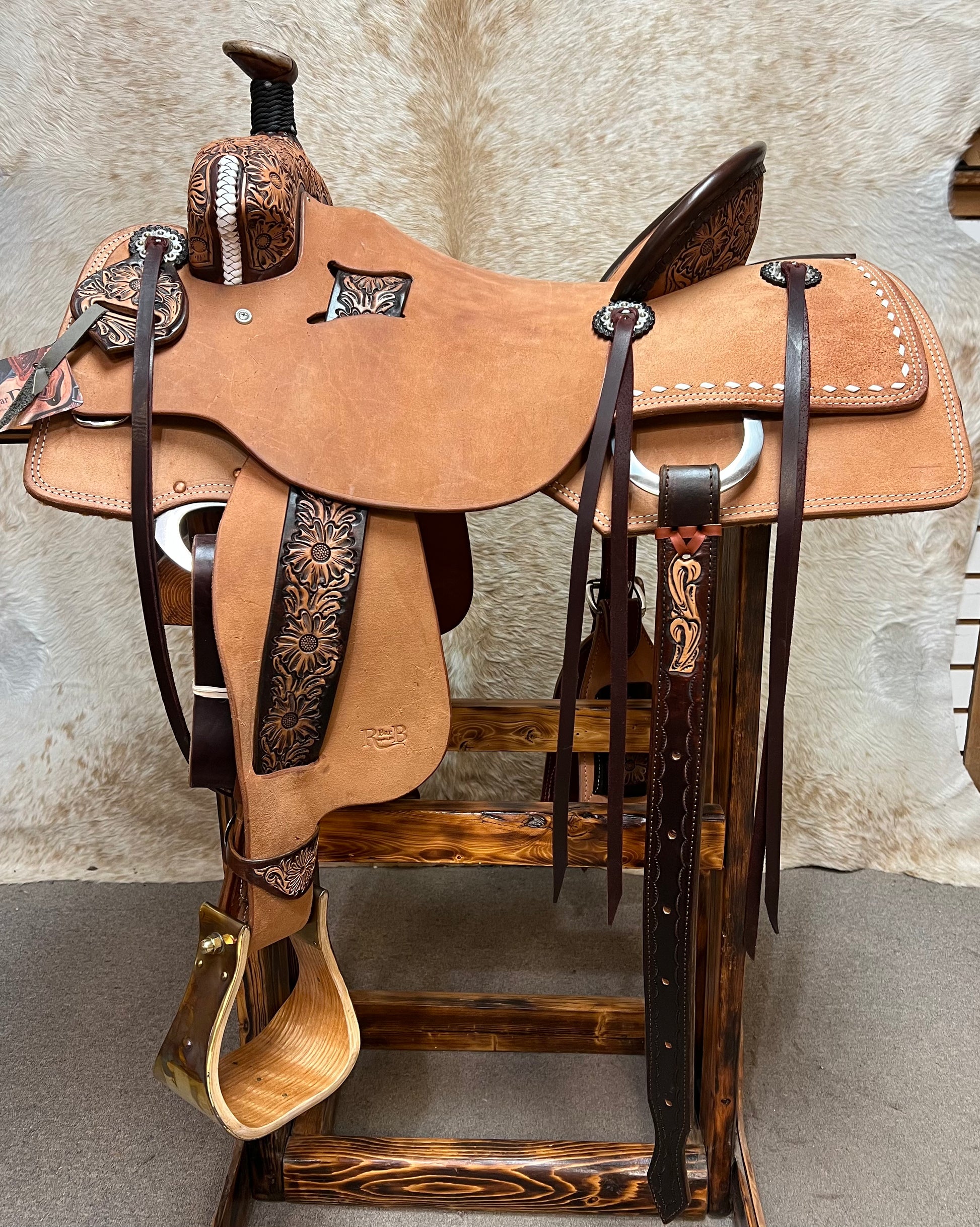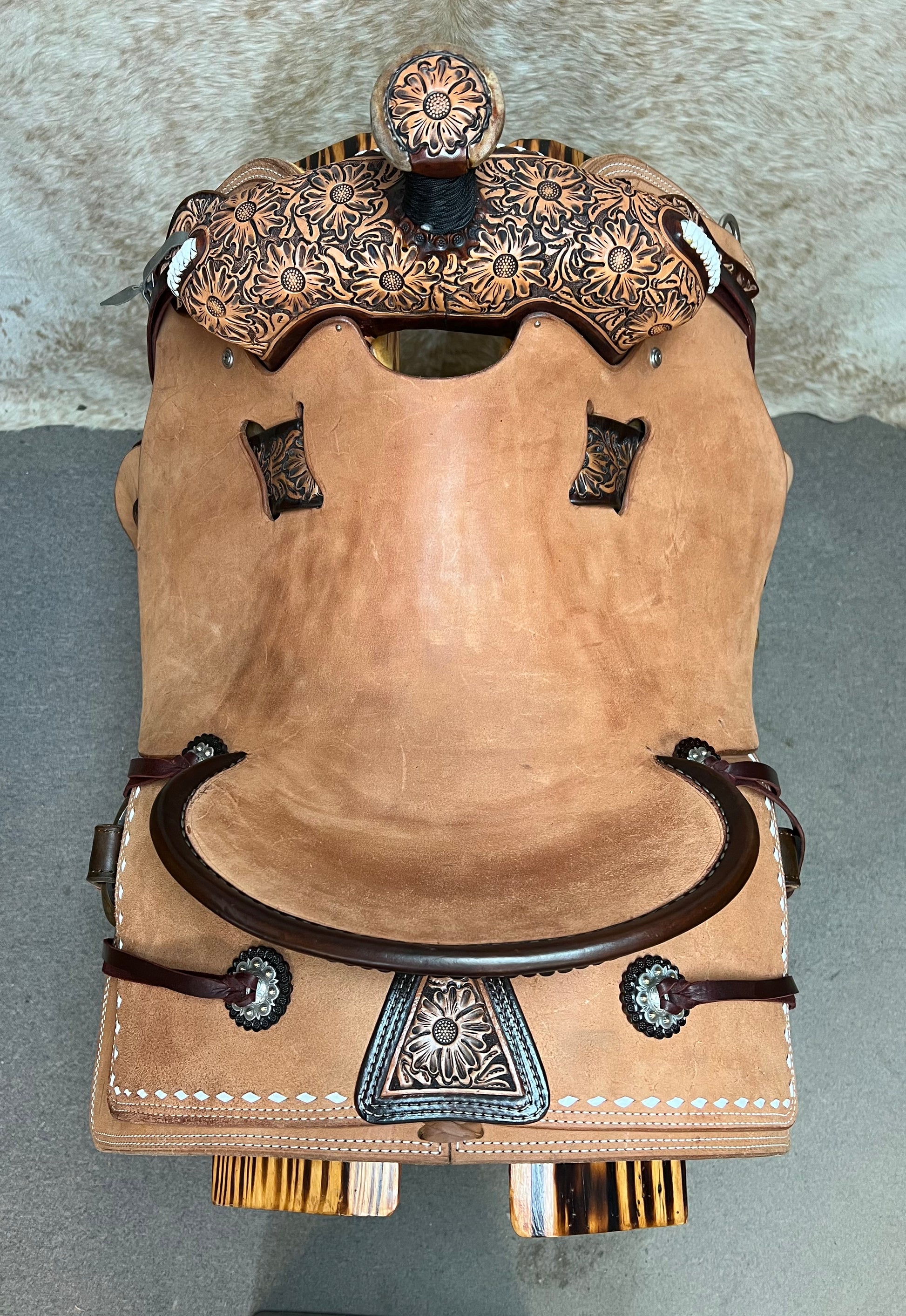 1/8 Tool Floral, White Buckstitch, Loop Seat, Tooled In and Out Stirrup leathers, Roughout, Hard Seat, In Skirt Rig, Pencil Roll, Real Wool