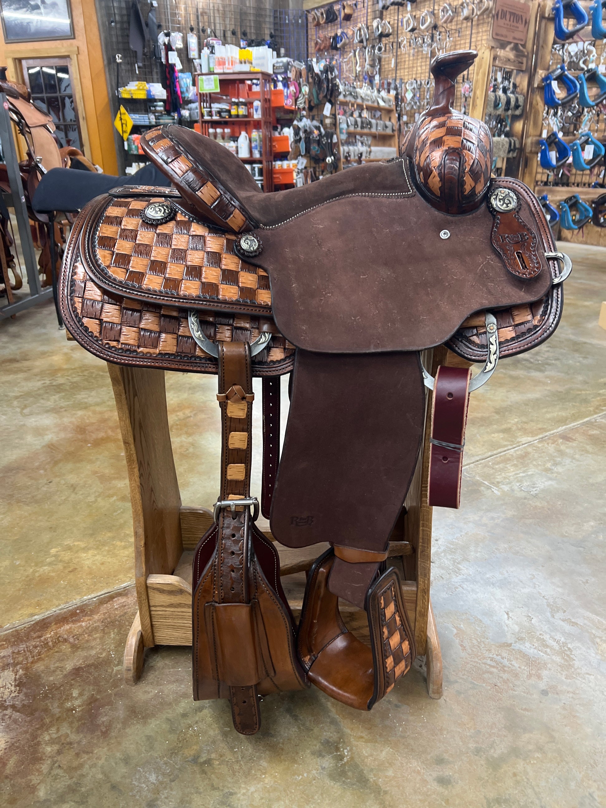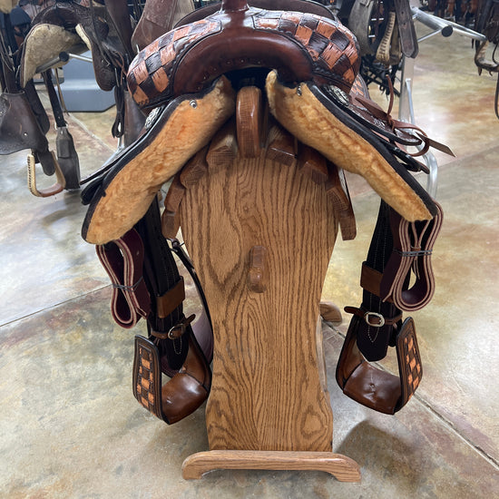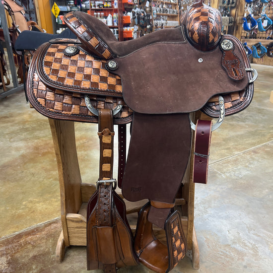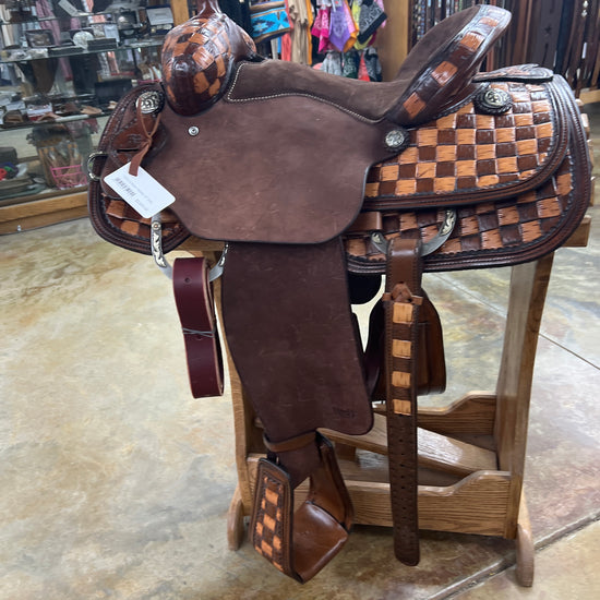 1/2 Tool Big Basket Stamp, Two Tone Checkered, Chocolate Suede Seat, Chocolate Leather, Roughout Jockey and Fender, Upgraded Conchos and Hardware, Leather Covered/Tooled Slanted Stirrups.