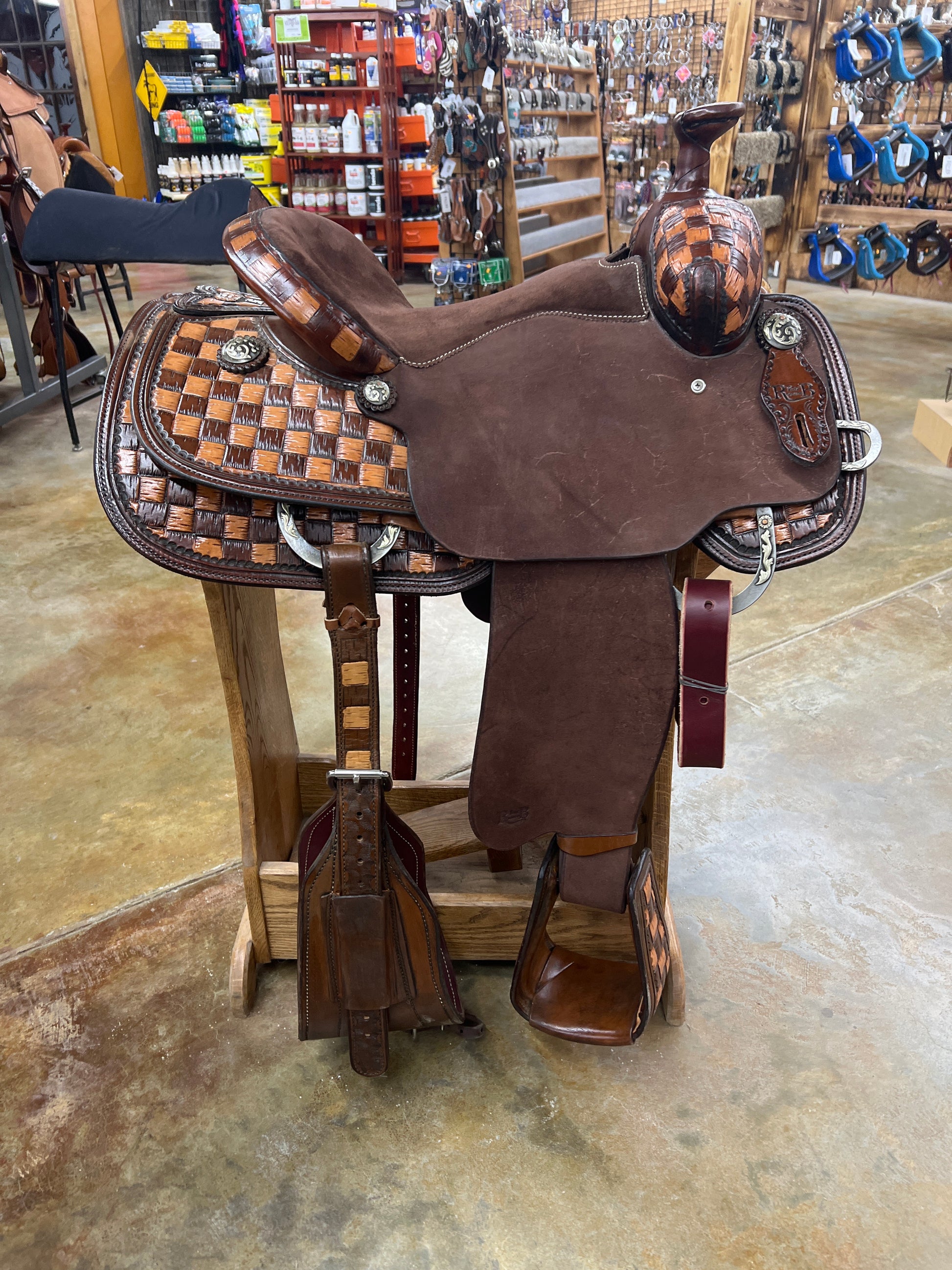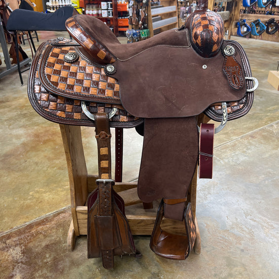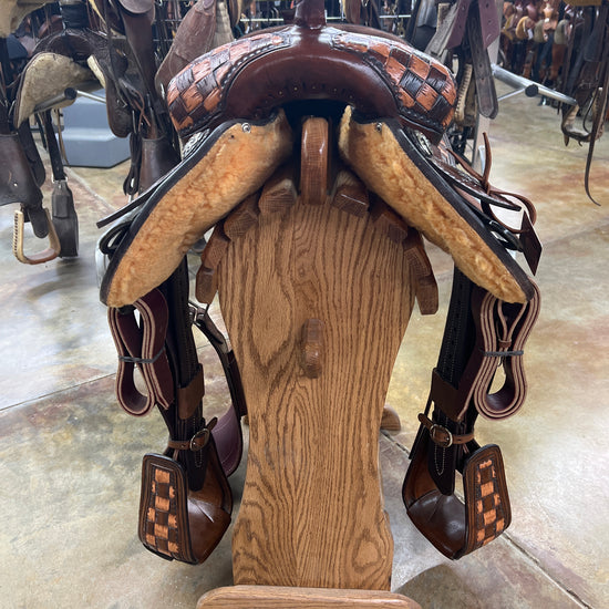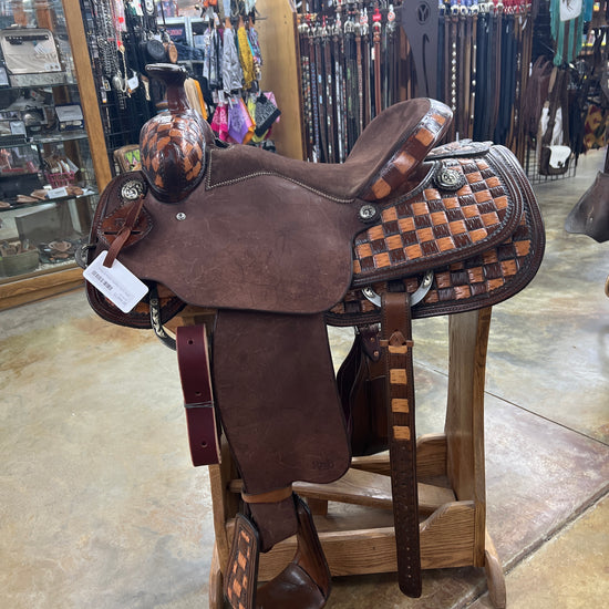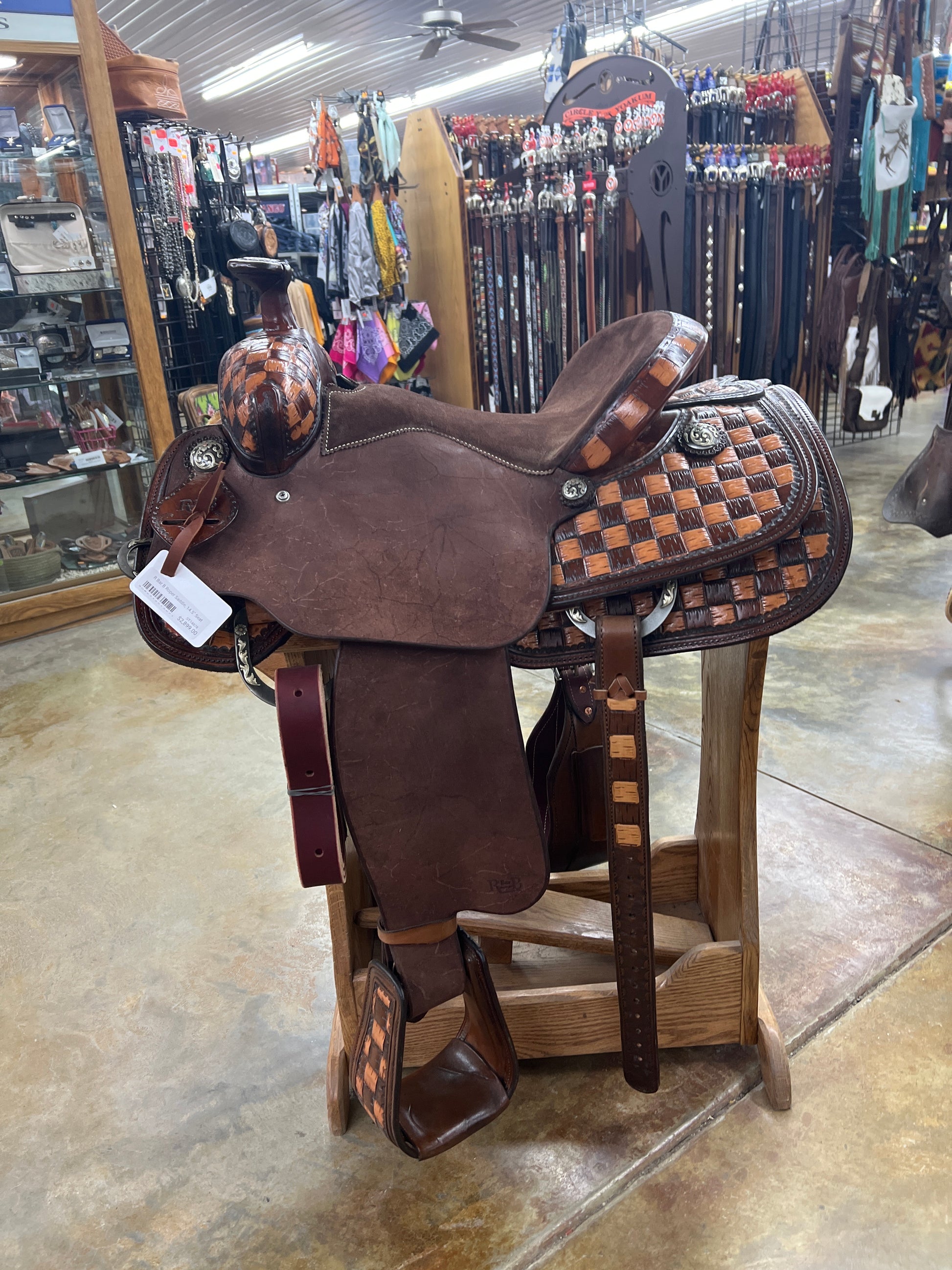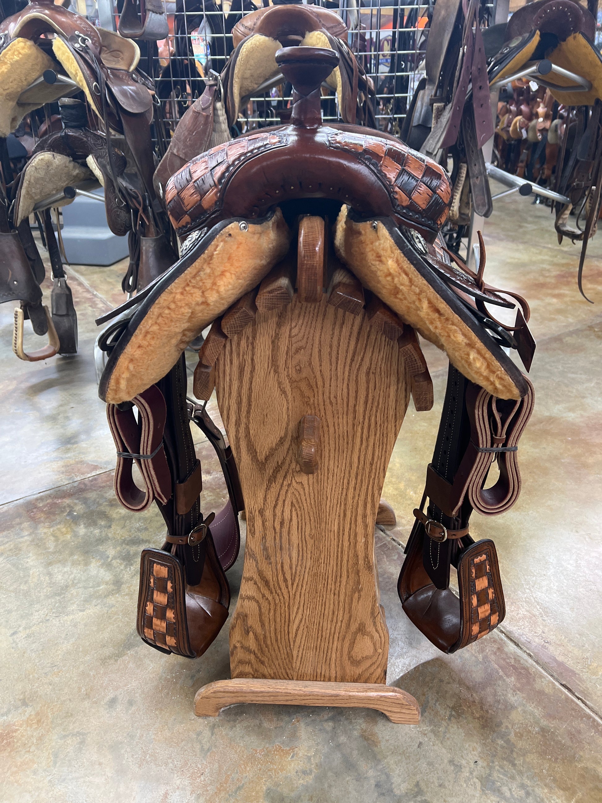 1/2 Tool Big Basket Stamp, Two Tone Checkered, Chocolate Suede Seat, Chocolate Leather, Roughout Jockey and Fender, Upgraded Conchos and Hardware, Leather Covered/Tooled Slanted Stirrups.