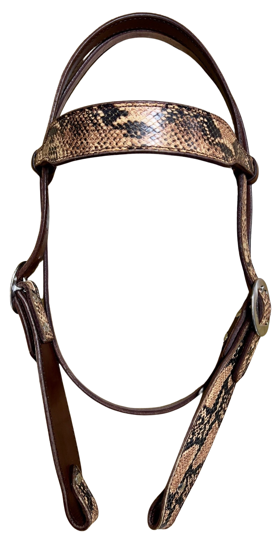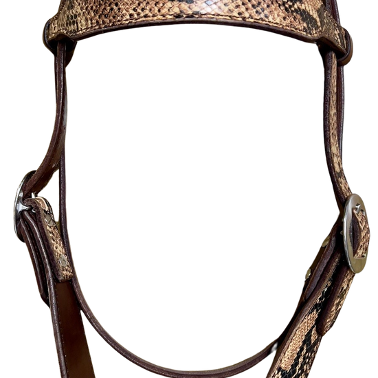 This headstall features a striking snake print design on the browband, adding a touch of unique style to your horse's bridle. Made with durable materials, it offers both functionality and fashion for your riding needs. Upgrade your equestrian gear with the R Bar B Snake Print Browband Headstall.