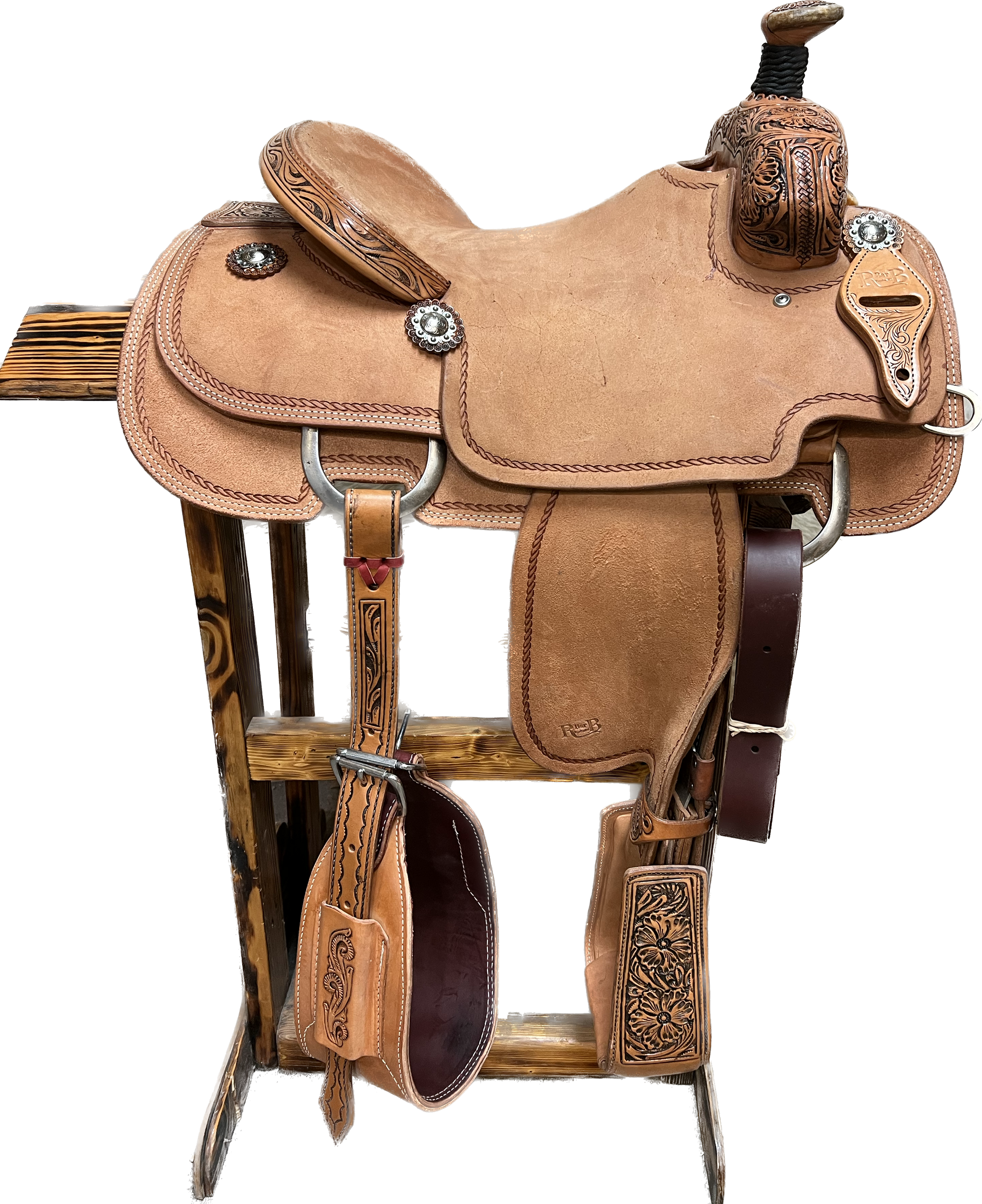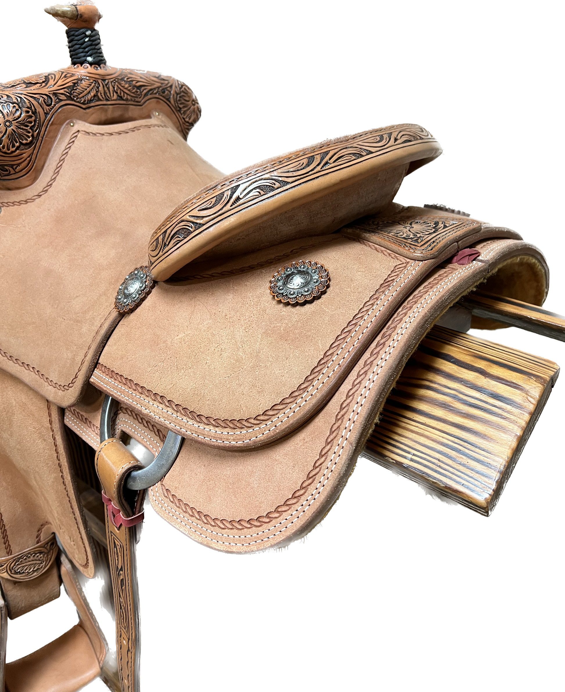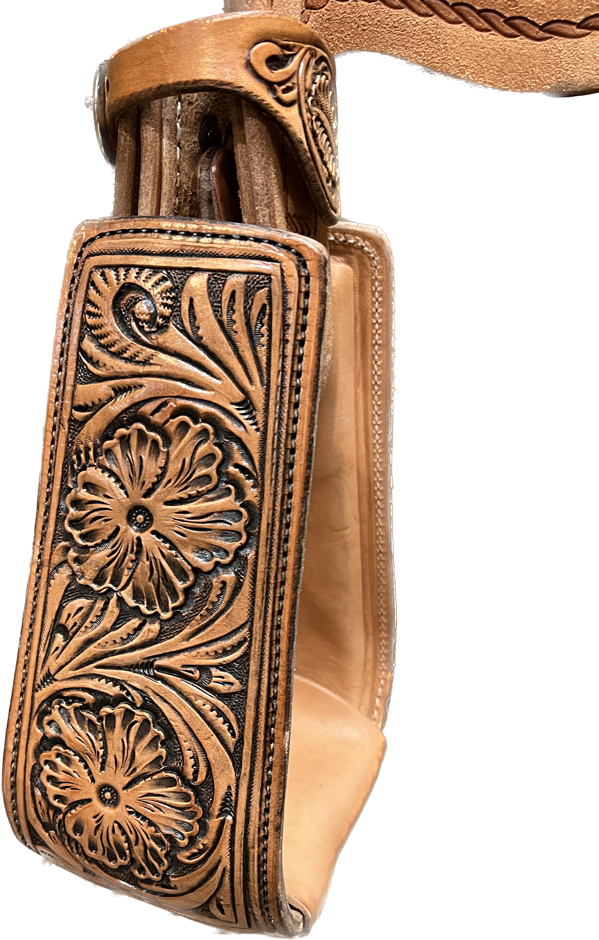 Double Leather, 1/8 Tool Floral, Hard Seat, Rope Border, Matching Tooled Stirrups, Real Wool