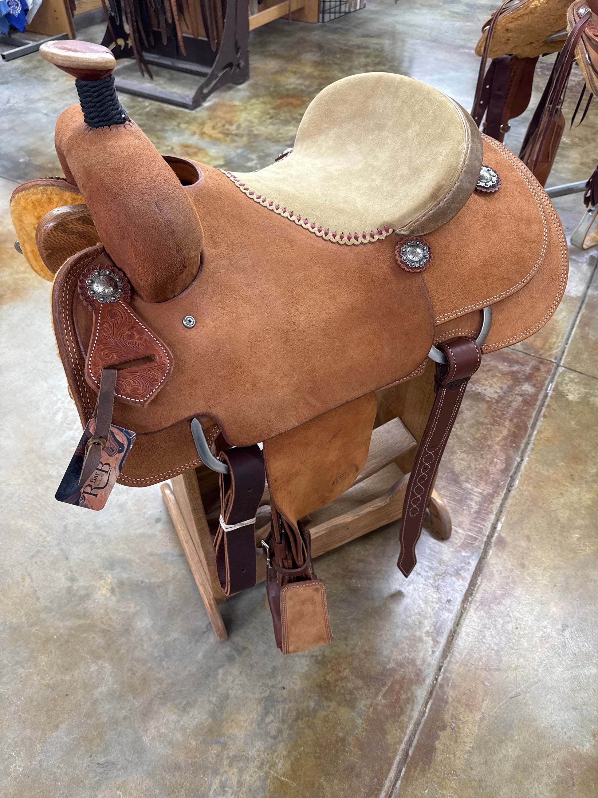 All Roughout, Double Thick Leather, Double Stitched, Tan Suede Bicycle Seat/Laced, Leather Covered Deep Roper Stirrups. Rawhide Cantle Binding, Rawhide Horn Lip