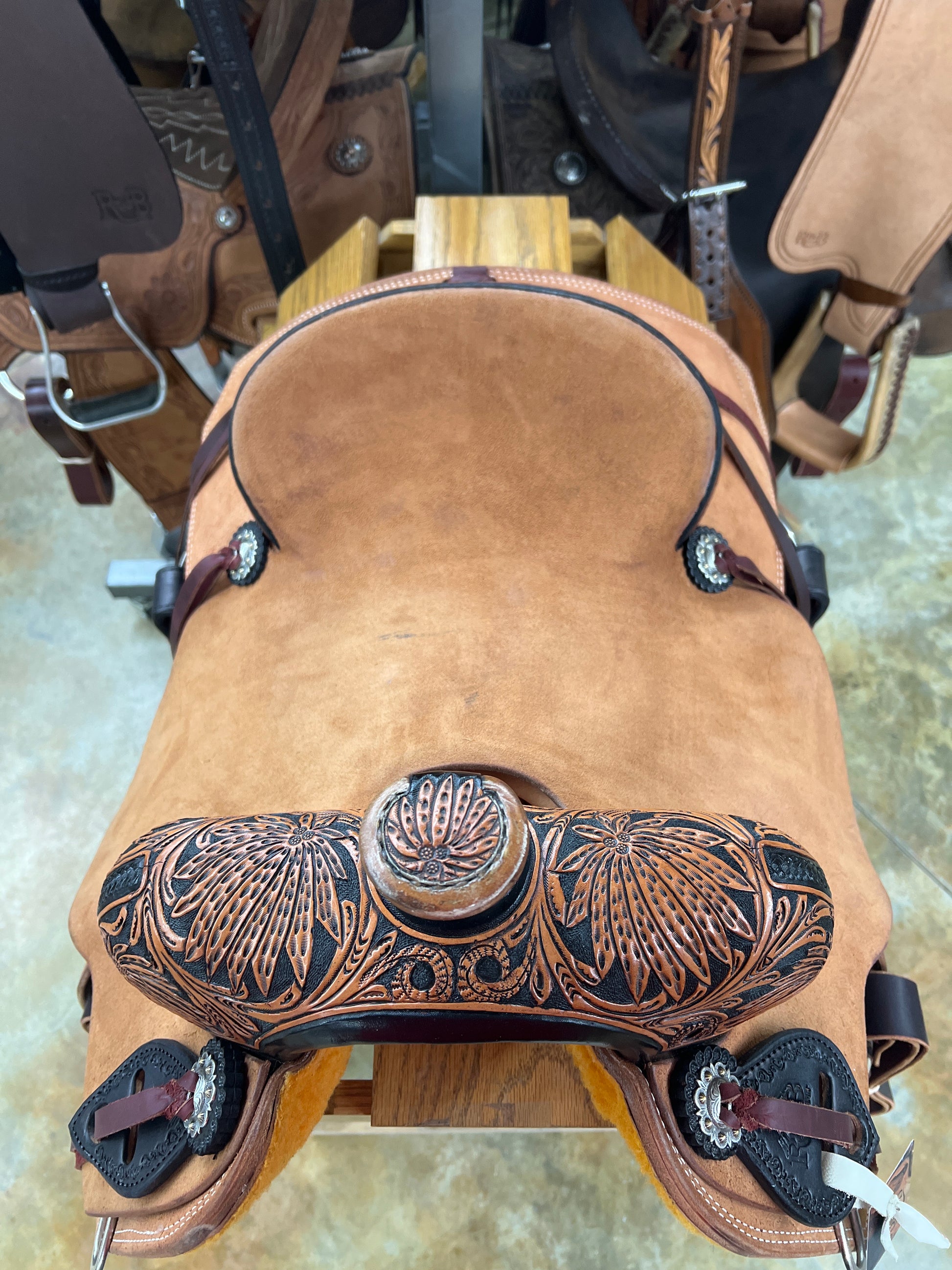 1/8 Tool Floral, Tooled Cheyenne Roll, Real Wool, Hard Seat, Roughout Seat/Jockey/Fender/Rear Housing/Skirt, Braided Horn Knot, Saddle Strings, Rawhide Covered/Laced Stirrups