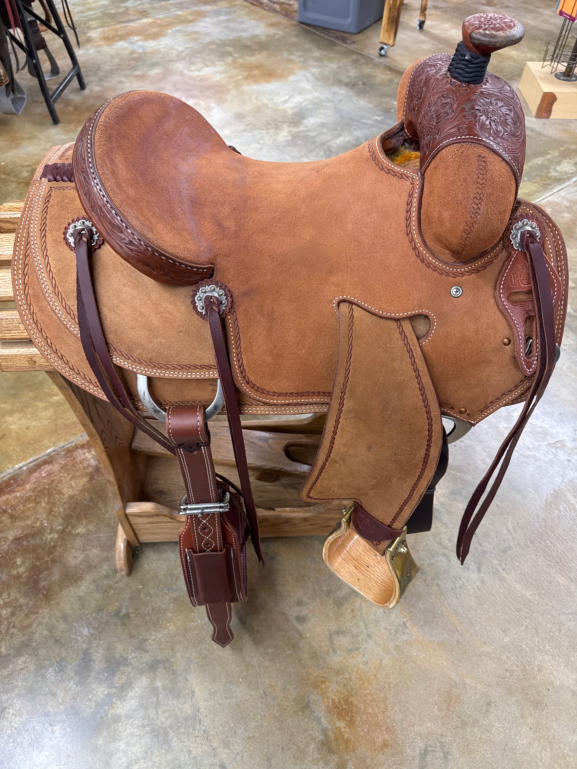 All Roughout, Hard Seat, Floral Tooled Overlay Swell, Tooled Leather Cantle Binding, Real Wool, Saddle Strings, Brass Covered Monel Stirrups