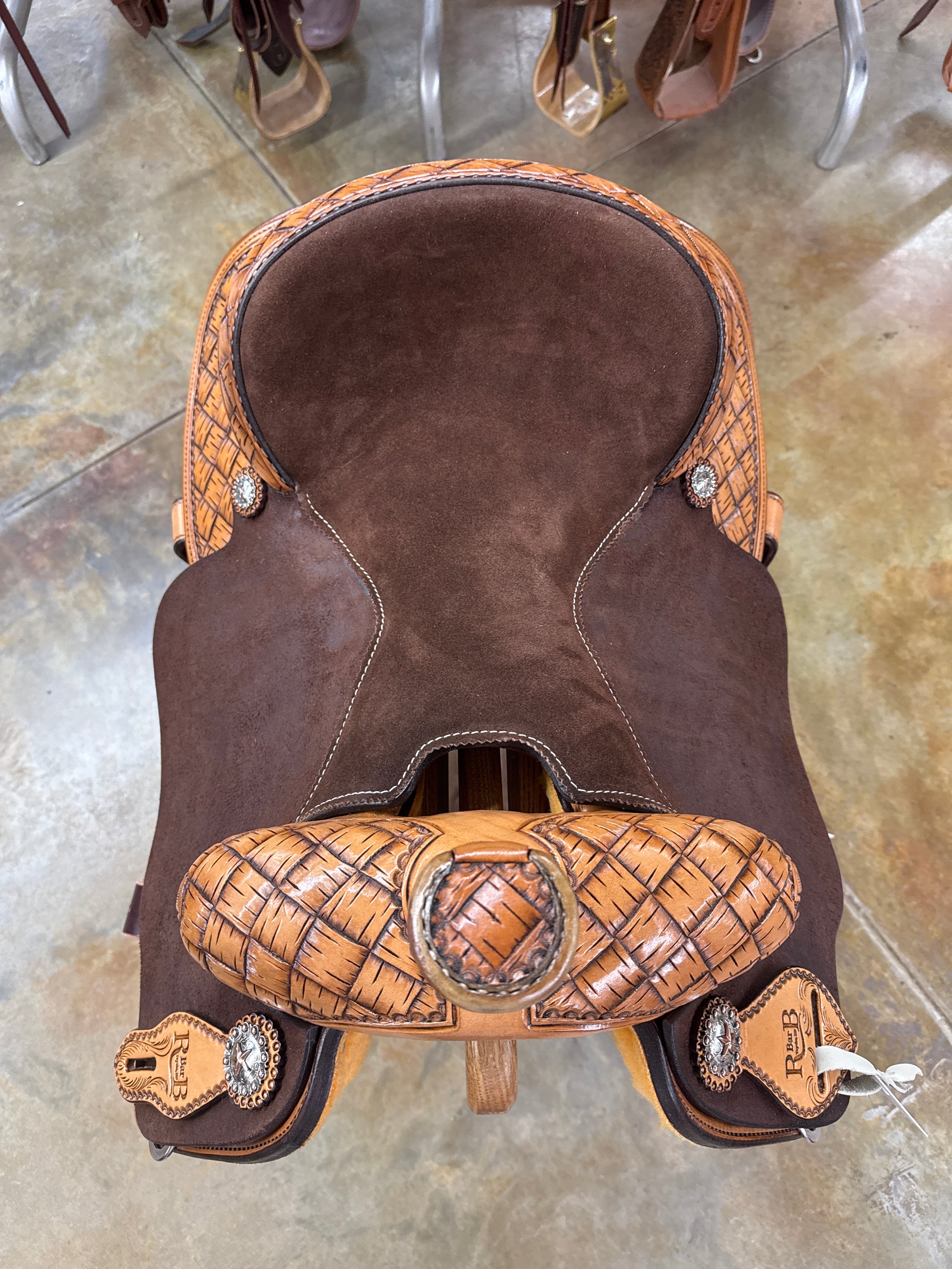 1/2 Tool Big Basket, Chocolate Leather on Jockey and Fender, Antique Finish, Chocolate Suede Seat, Cheyenne Roll, Rawhide Roper Stirrups