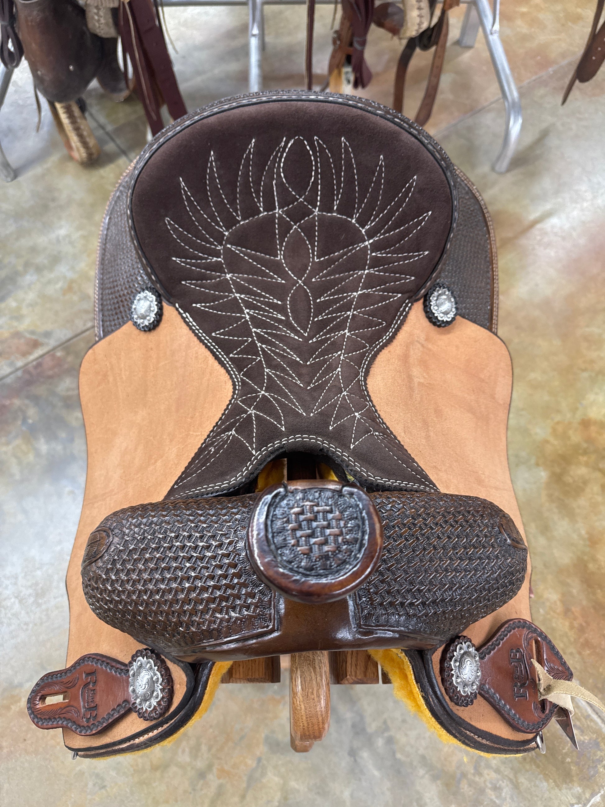 1/4 Tool Basket Stamp, Roughout Skirt/Jockey/Fender, Chocolate Suede Quilted Seat, Cheyenne Roll, Rawhide Covered Stirrups