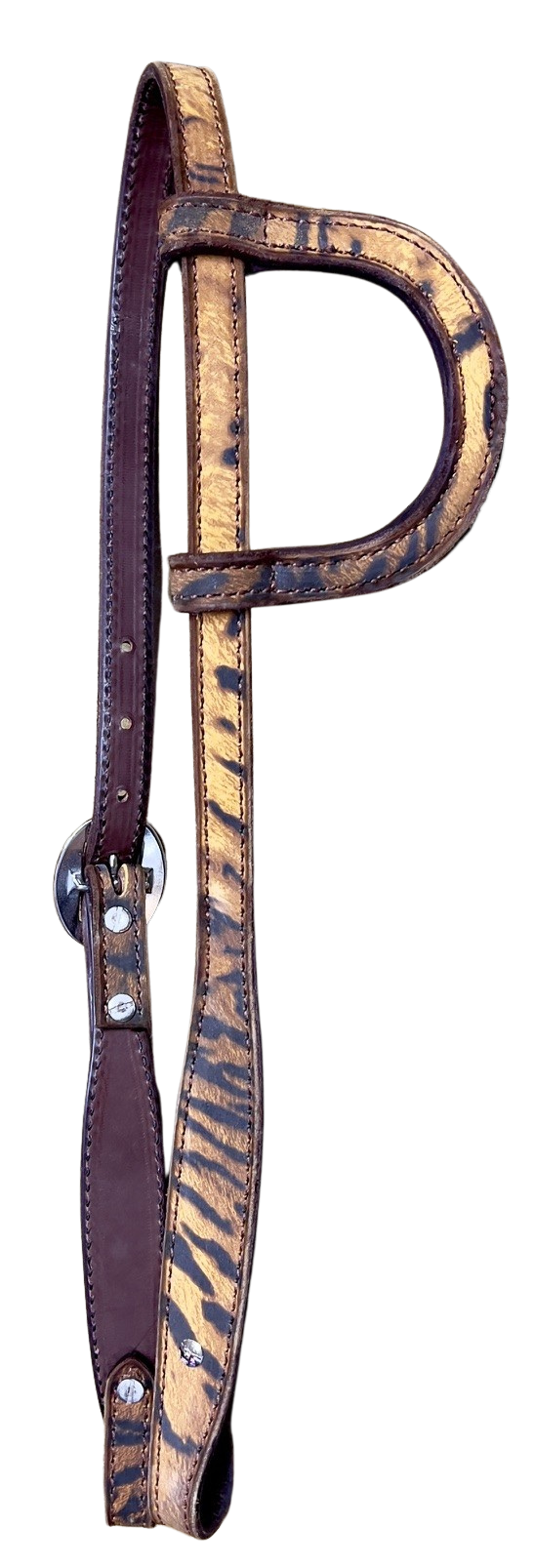 Elevate your riding with our R Bar B Tiger Print One Ear Headstall! Stand out with the unique tiger print design and experience a secure fit with the one ear construction. Take your horsemanship to the next level and make a bold statement.