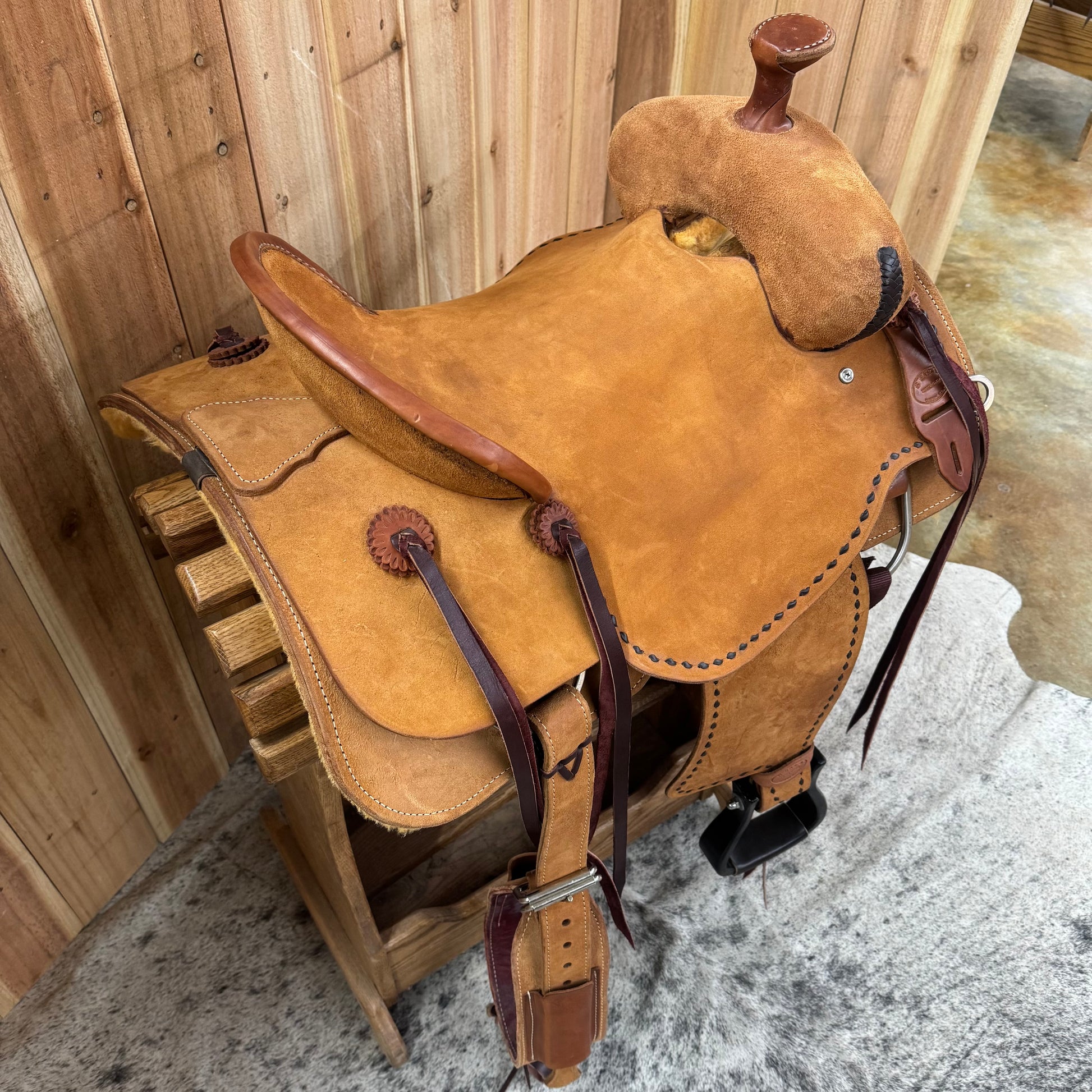 All Roughout, Black Buckstitch, Braided Swell Caps, Hard Seat, Leather Pencil Roll, Saddle Strings, Black Wood Stirrups