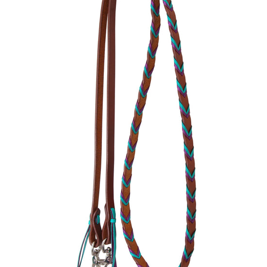Rafter T 5/8" Harness Leather w/Purple and Turquoise Plait Barrel Rein