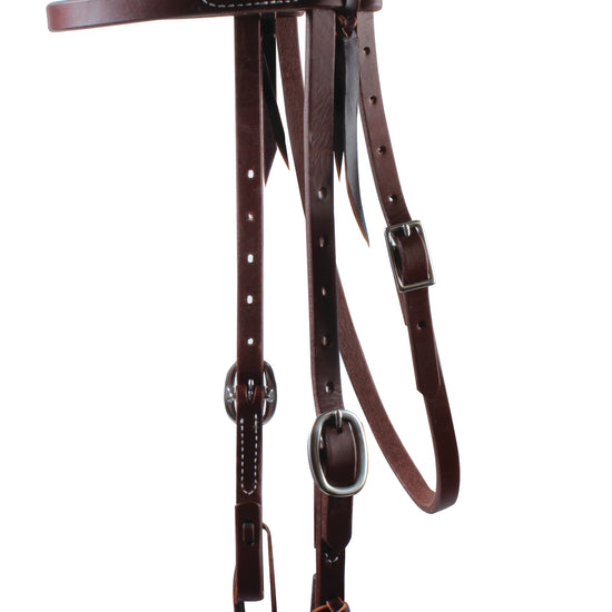 Single-ply 12 oz plus harness leather with either single or double adjust stainless steel buckles. Heavy oil with tie cheeks. Buckle holes are oval for easy adjustment.