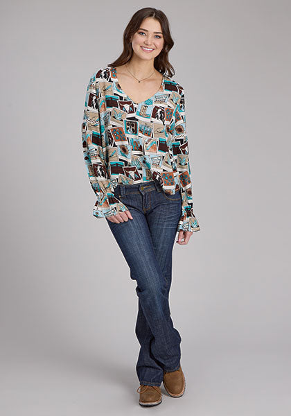 Roper Women's Long Sleeve Printed Photo Collage Rayon Peasant Blouse