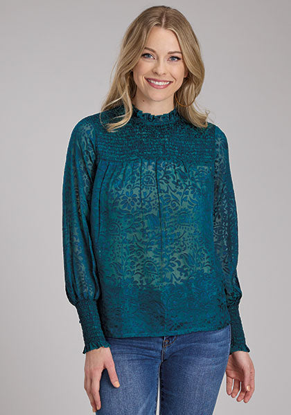 Elevate your style with our Roper Women's Poly/Rayon Teal Floral Burnout Blouse. The shirred front and back yokes and cuffs, along with the ruffle stand collar, add feminine flair to this blouse. With a keyhole at the center back neck and elastic loop closure, it's a versatile and fashionable addition to your wardrobe.