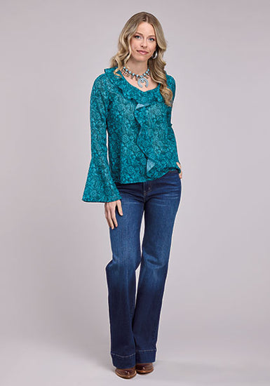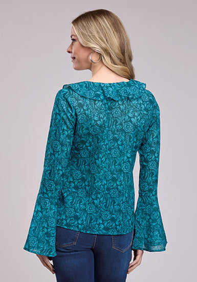 Roper Women's Teal Tooled Floral Print Peasant Top
