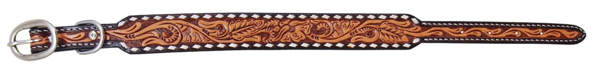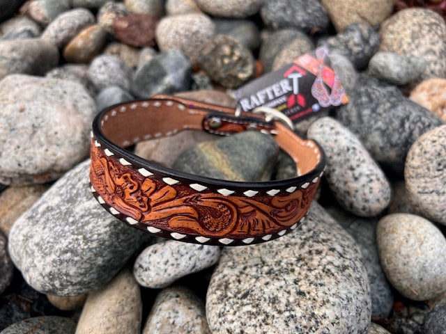 Rafter T Brown Leather Tooled Dog Collar w/White Buckstitch