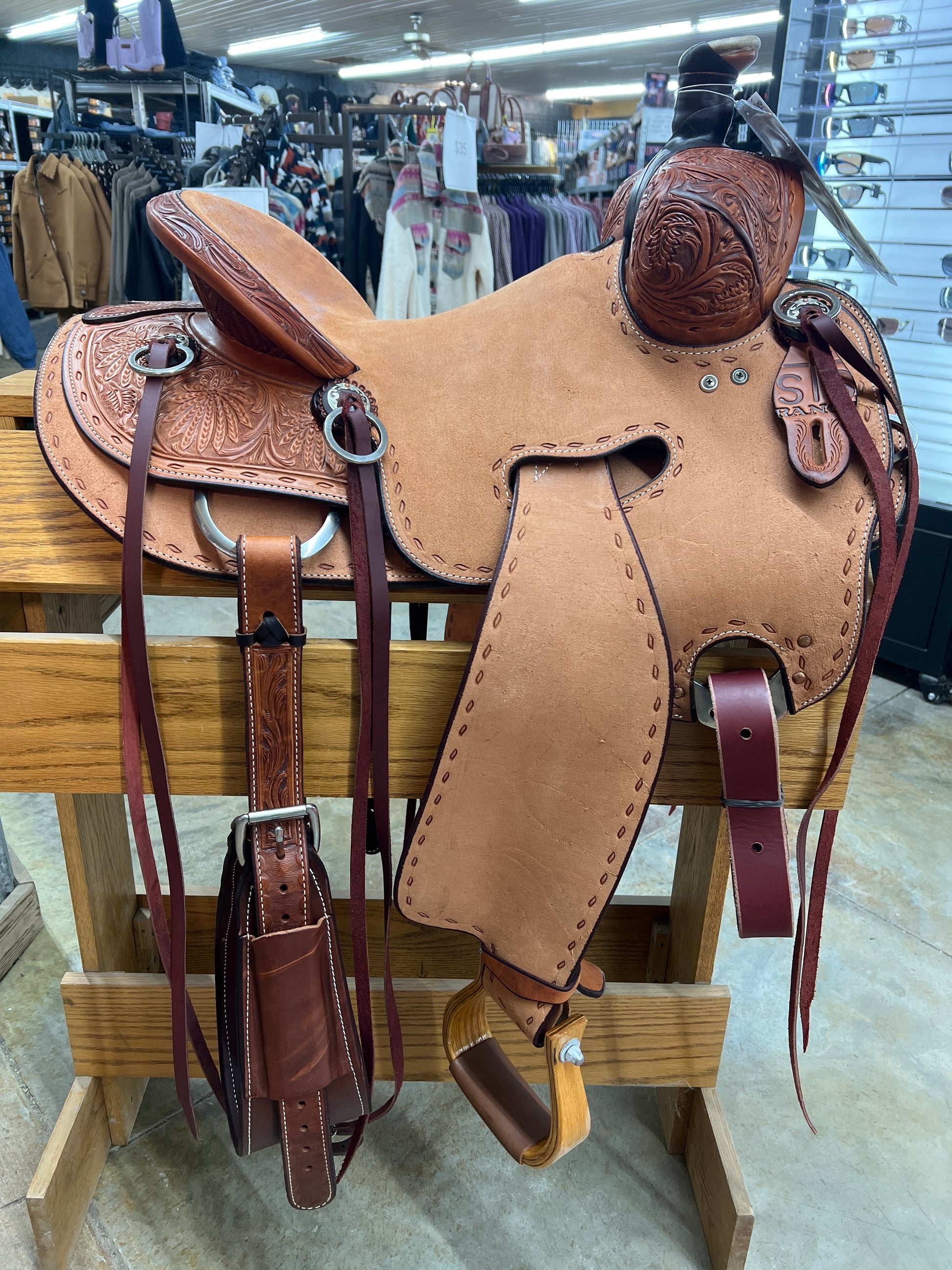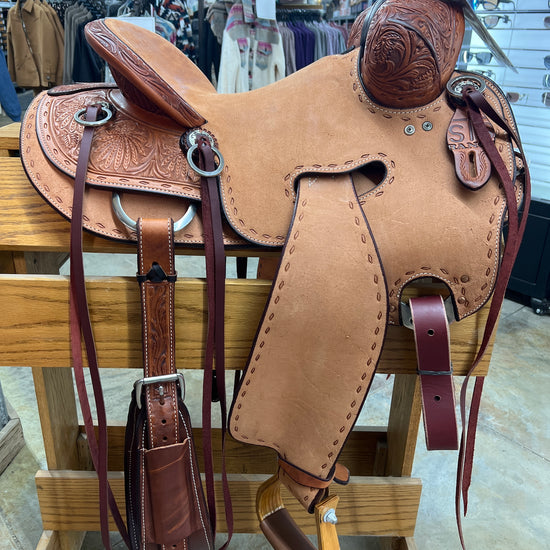 1/4 Tool Floral, Roughout Skirt/Seat/Jockey/Fender, Hard Seat, Cheyenne Roll, Real Wool, Brown Iron/Silver Conchos, Saddle Strings, Wood Stirrups