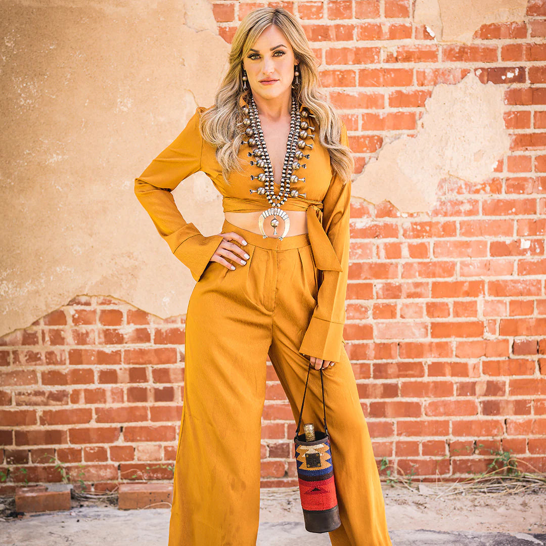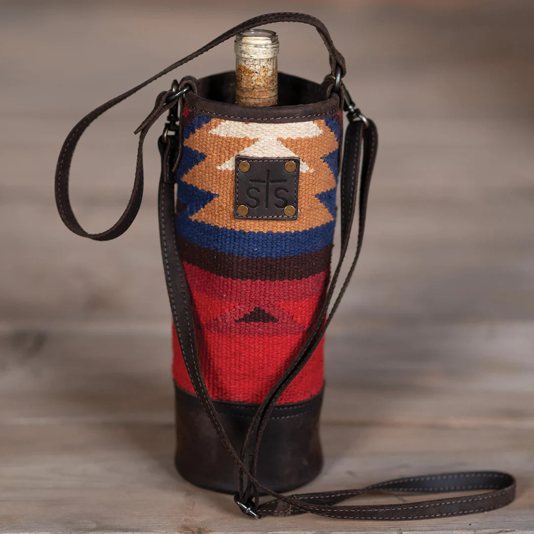 The Crimson Sun is the perfect combination of crimson red serape and matte-natural chocolate full grain leather. The Single Wine Bag features ombré, Aztec pattern unique to the shape of the bag.
