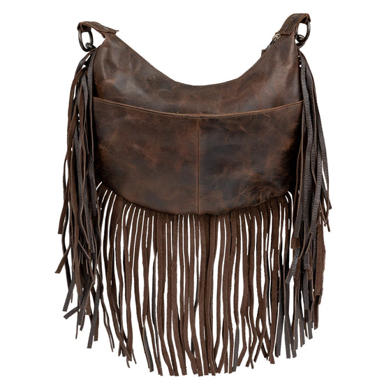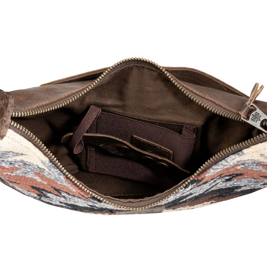 The Guadalupe Serape Nellie Fringe Bag captures the essence of fall with its rich palette of browns, creams, grays and black colors and is crafted from hand-woven cotton with full grain leather accents for a timeless rustic charm.