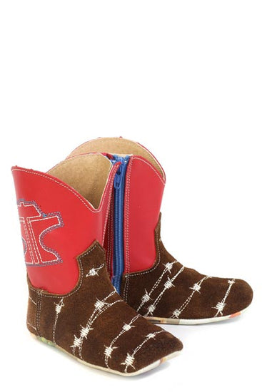 Set your little one apart with Tin Haul Mini Infant Don't Fence Me In Boots! With a square toe and barbwire detailing on the brown suede vamp, these handmade boots make a statement. The cushioned insole and side zip make them comfortable and easy to wear. Give the gift of style and comfort to your little cowboy or cowgirl.