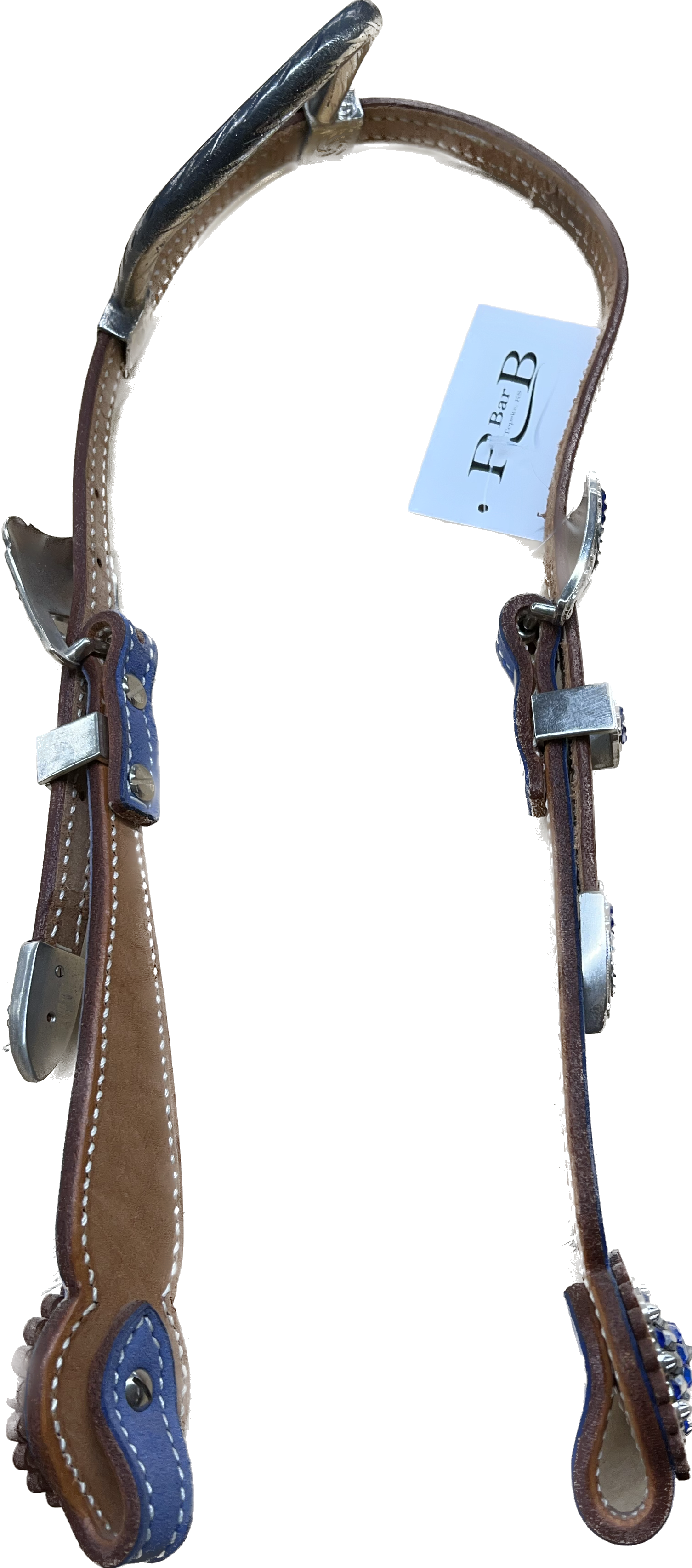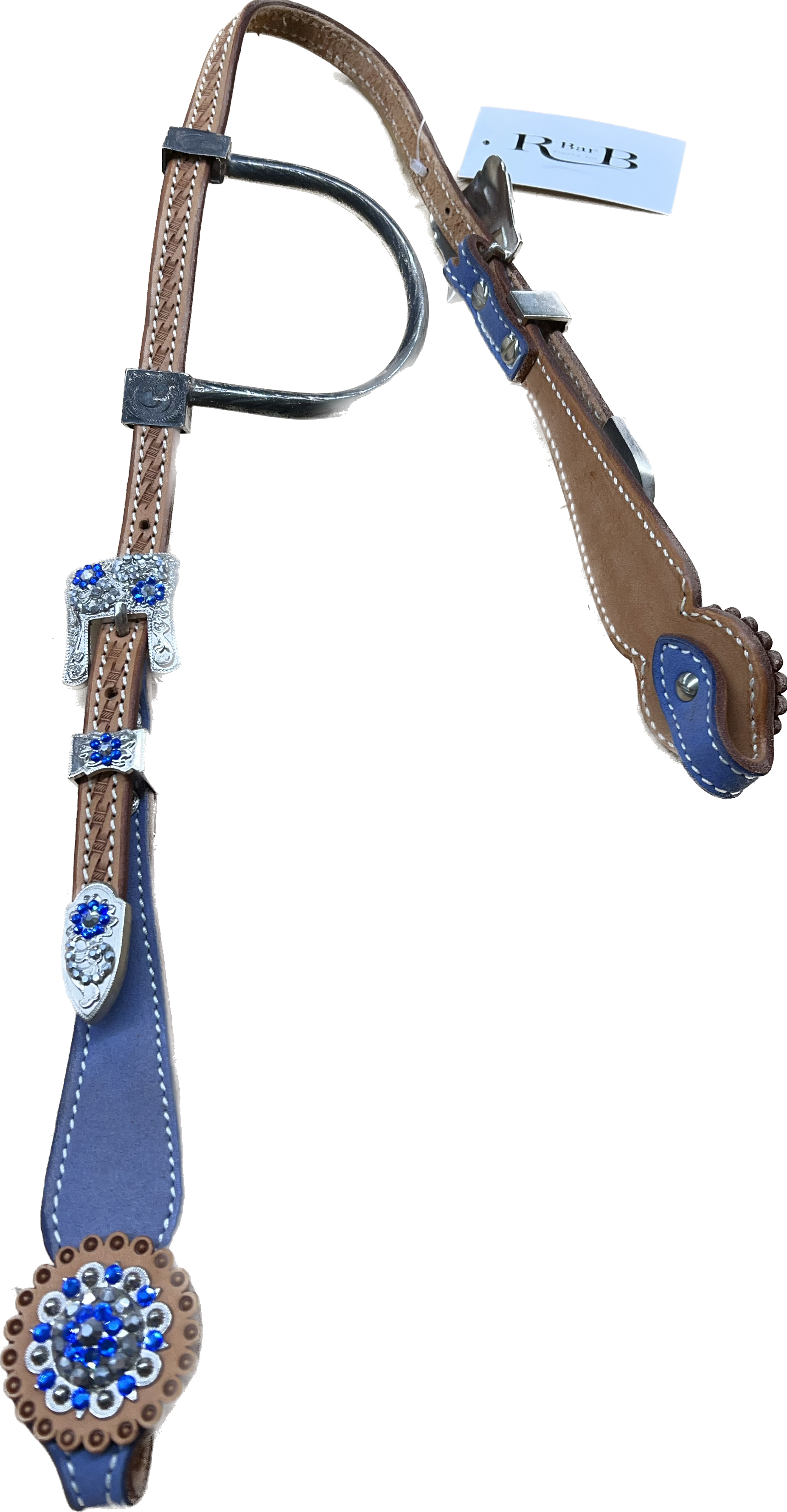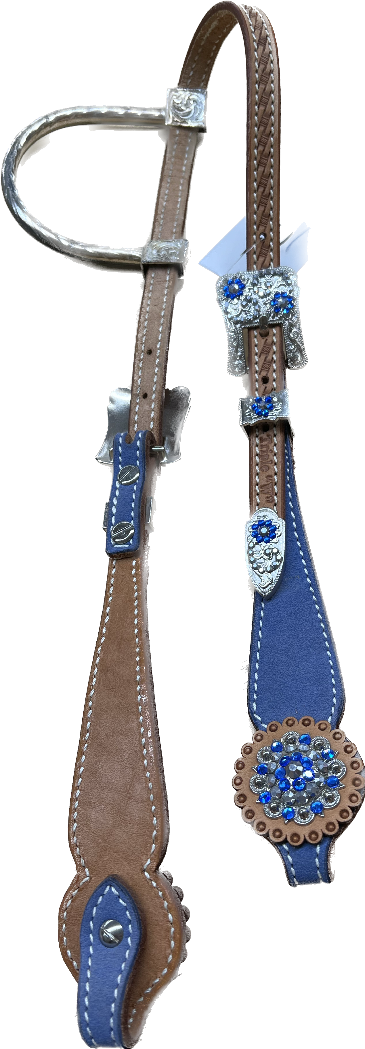 Triple "W" Sample Headstall Basket Tooled With Blue Suede Side Cheeks and Blue and White Crystal Conchos and Buckles. Silver Shaped Ear