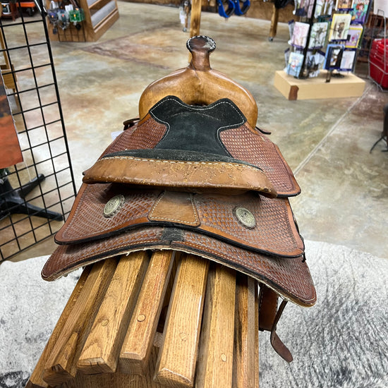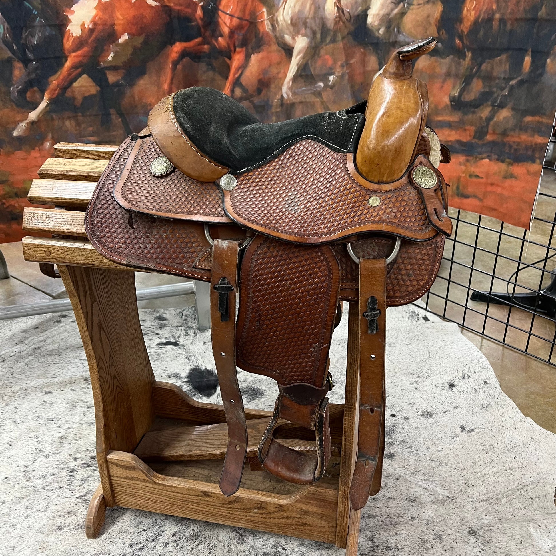 Basket Stamp, Black Suede Seat, Smoothout Cheyenne Roll/Swell Cover, Leather Covered/Sewn Stirrups