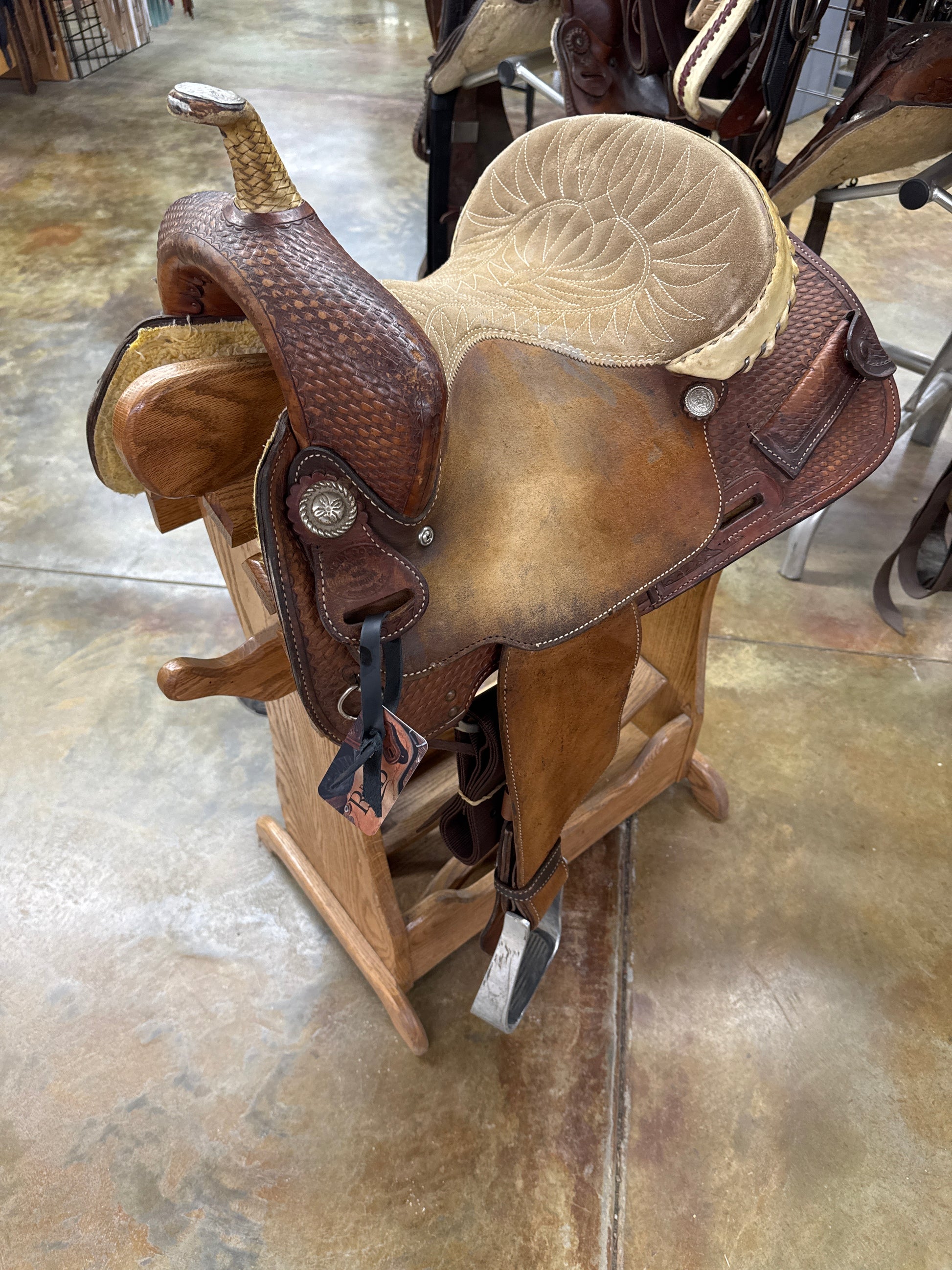 1/2 Tool Basket Stamp, Roughout Seat and Jockey, Stitched Suede Seat, Rawhide Silver Laced Cantle, Rawhide Braided Horn, Aluminum Slanted Barrel Stirrups