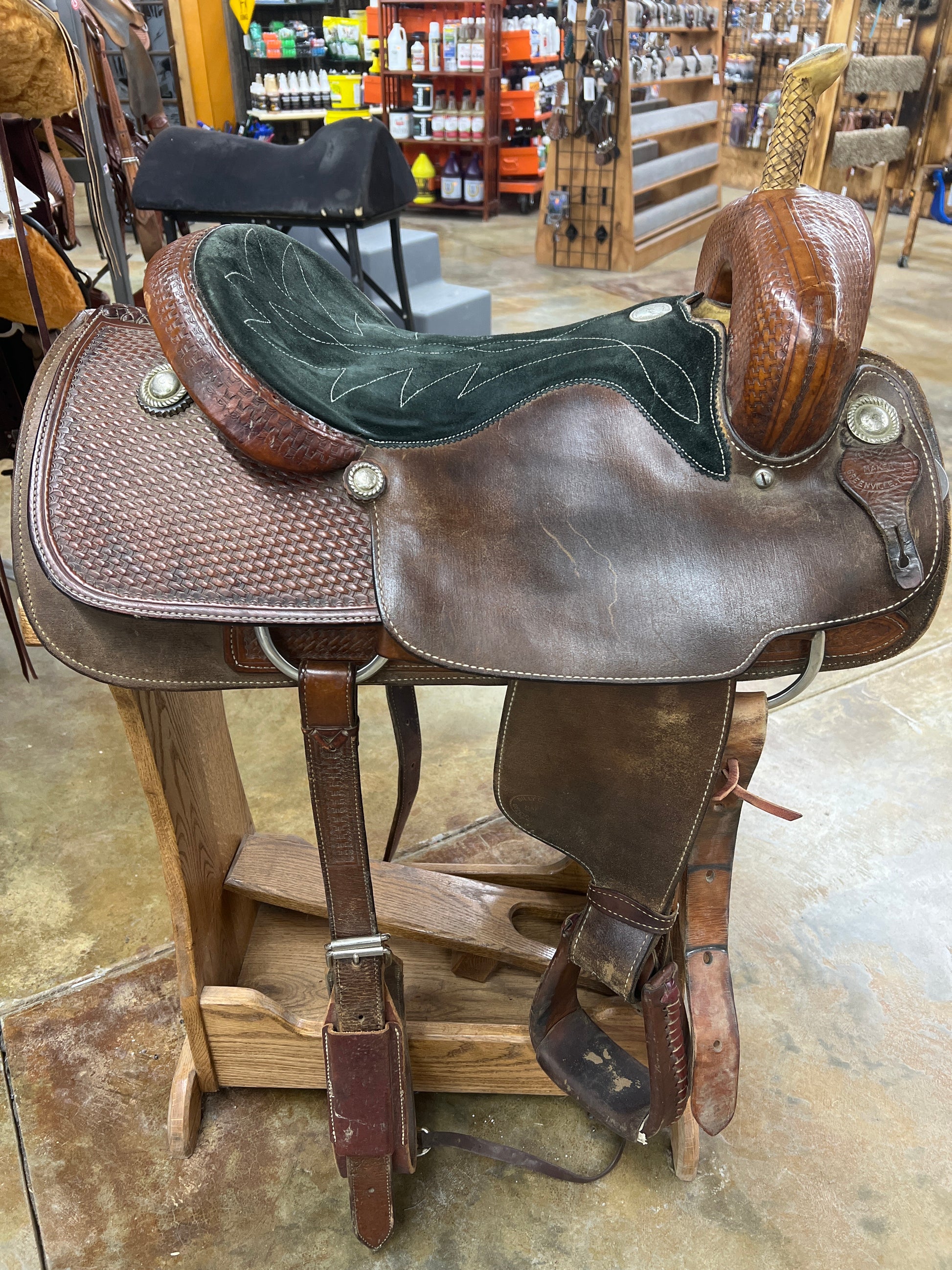 1/4 Tool Basket Stamp, Black Suede Stitched Seat, Rawhide Braided Horn, Leather Covered Stirrups