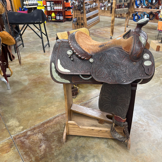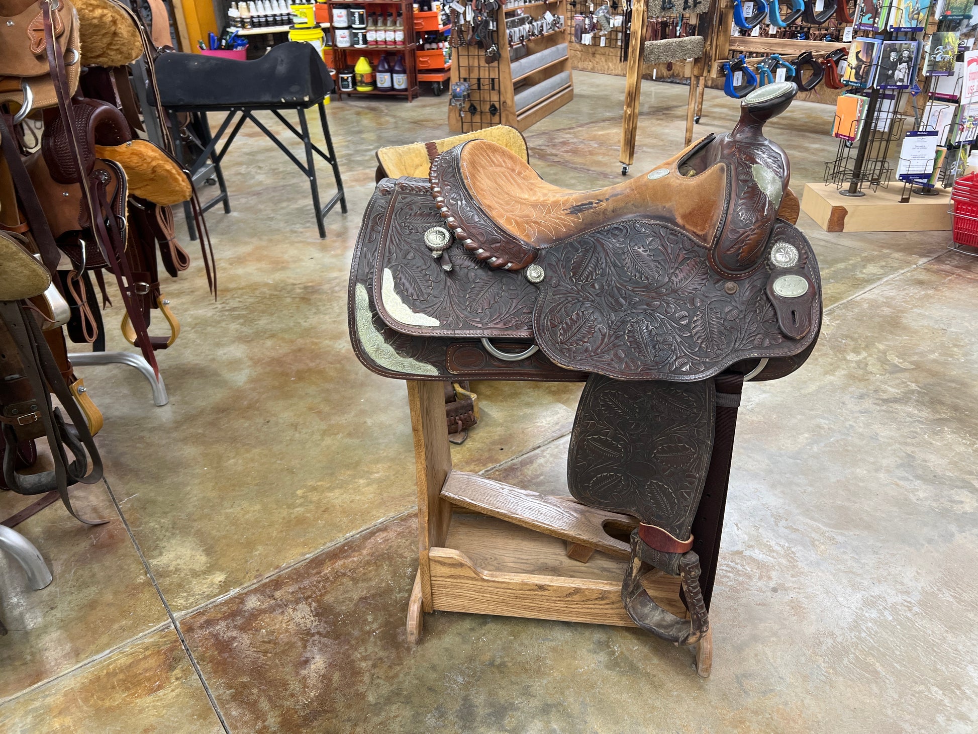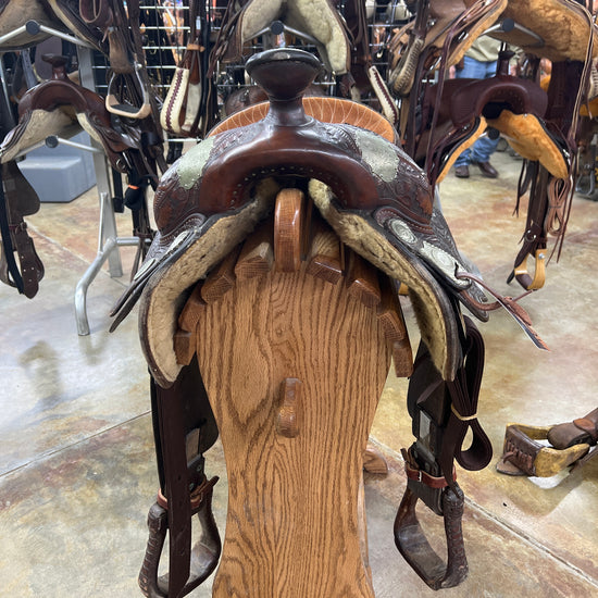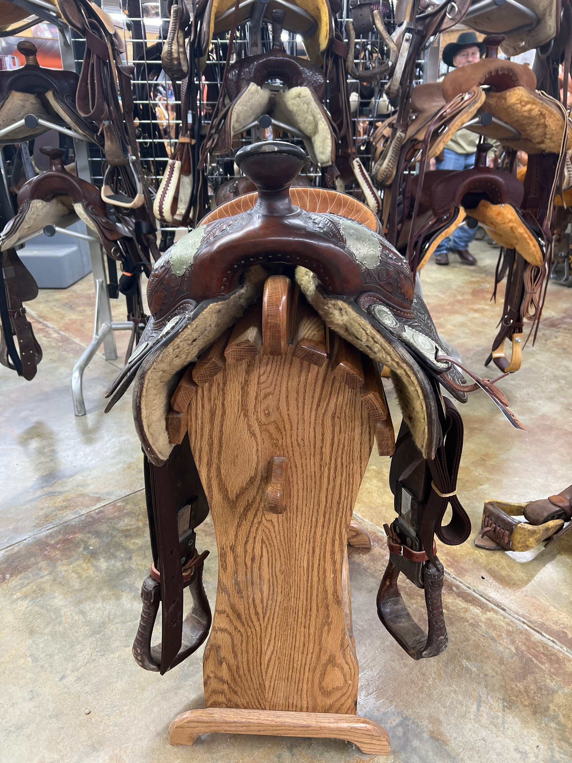 Full Tooled Acorn/Oak, Rust Suede Seat, Silver Laced Cantle, Silver Corners and Accents, Leather Covered Stirrups