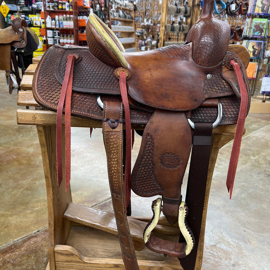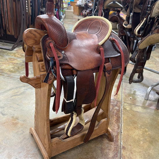3/4 Tool Basket Stamp, Smoothout Leather, Hard Seat, Rahwide Pencil Roll, Smoothout Leather, Saddle Strings, Rawhide Covered Stirrups