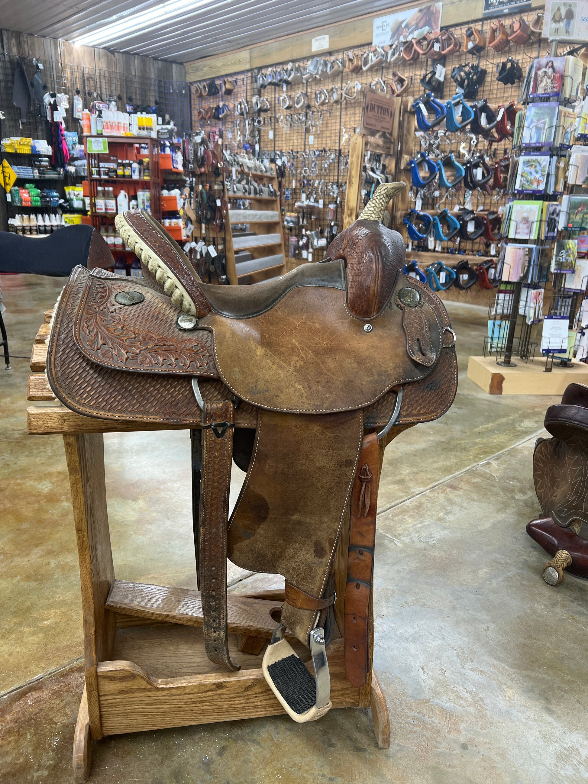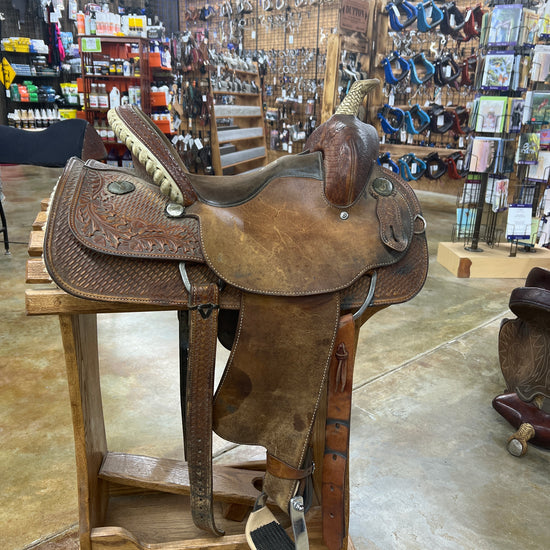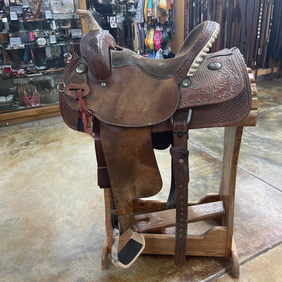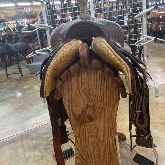 1/2 Tool Acorn and Oak/ Basket Stamp Combo, Brown Suede Seat, Rawhide Silver Laced Cantle, Rawhide Braided Horn, Slanted Aluminum Stirrups