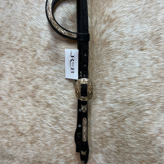 Used Black Show Headstall With Double Ear and Southwest Design Silver, Floral tooled leather, Like New Condition.