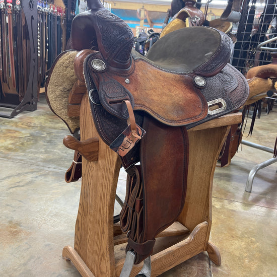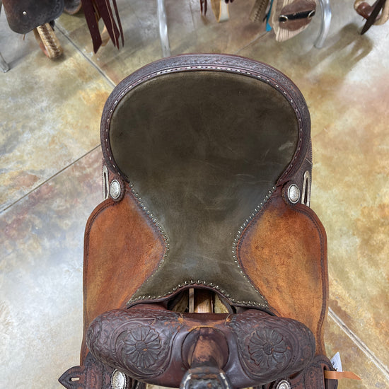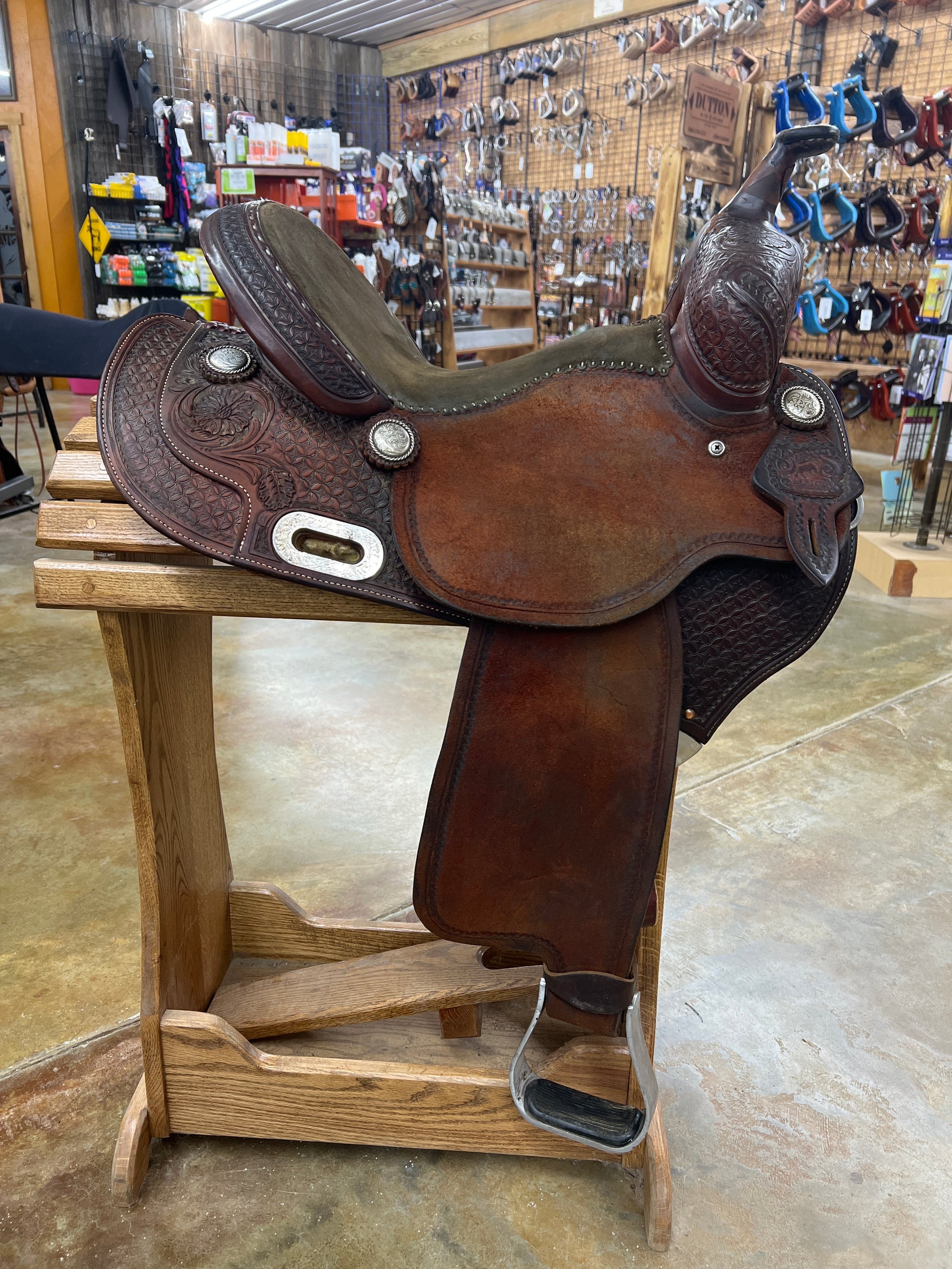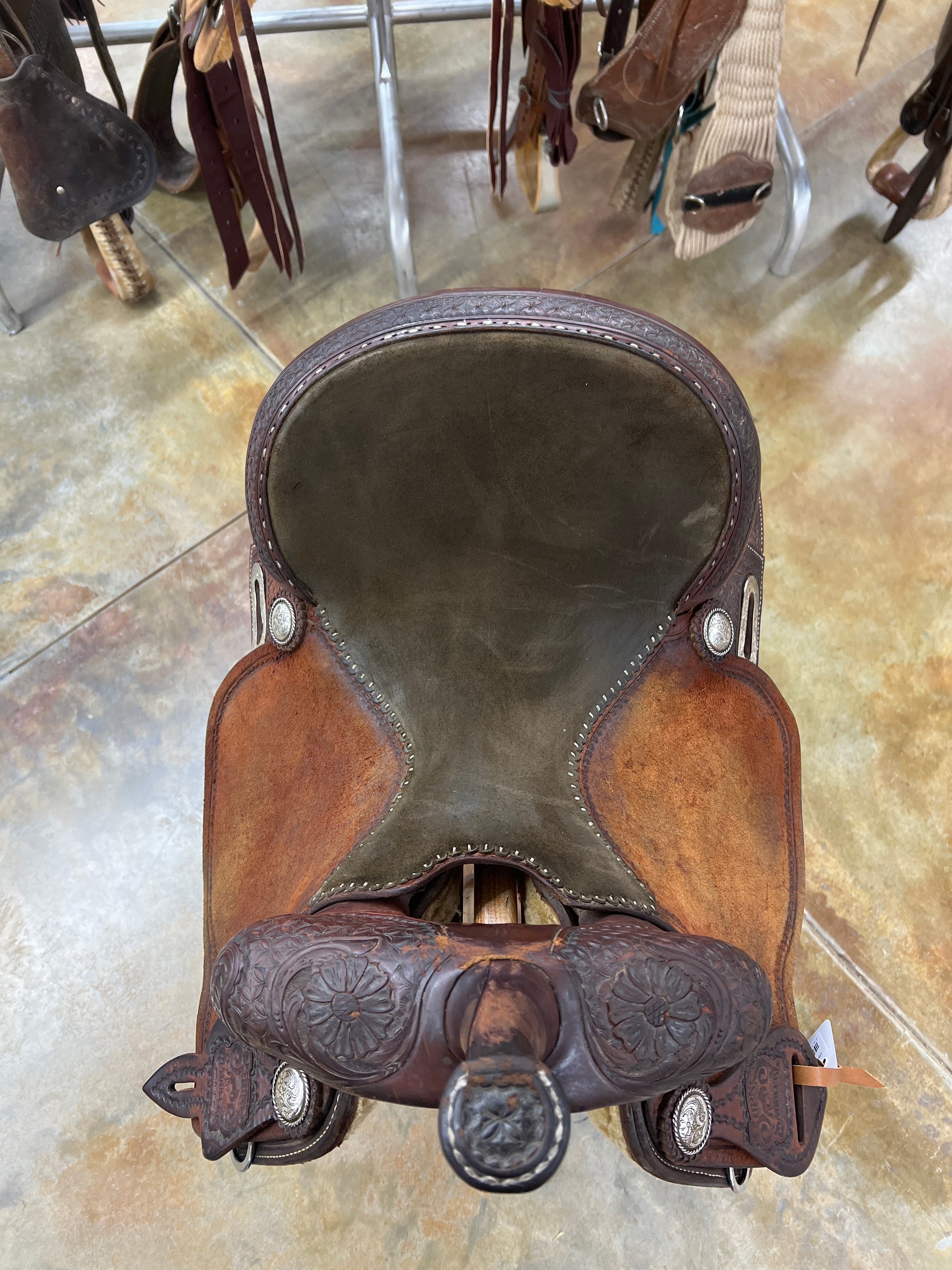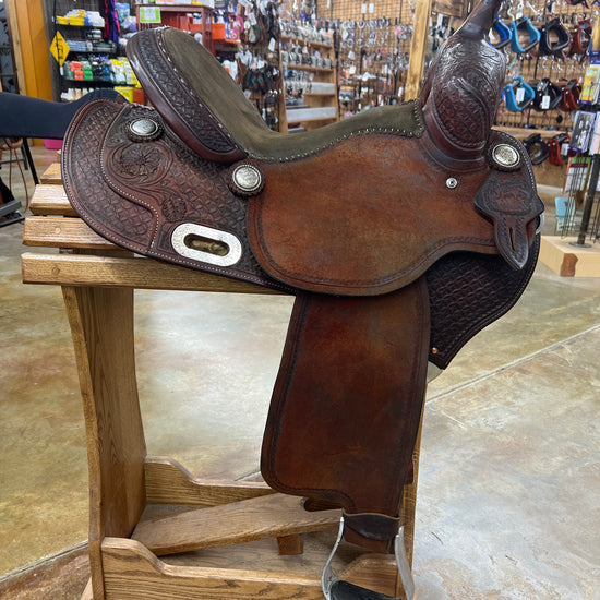 1/2 Tool Combo, Double Line Border, Roughout Jockey and Fender, Chocolate Suede Pop Stitched Seat, Aluminum Barrel Stirrups