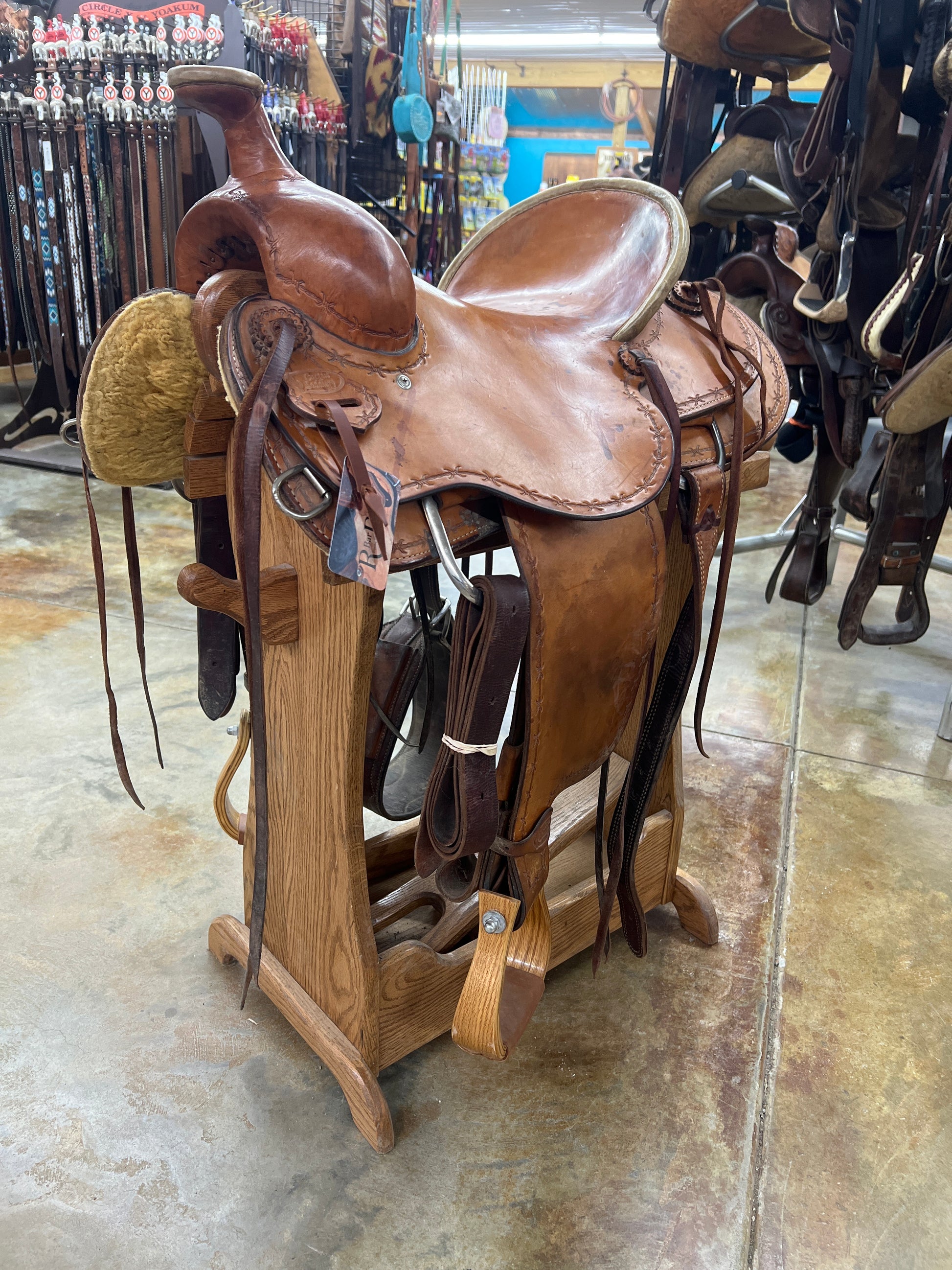 All Smoothout Leather, Barbwire Border, Hard Seat, Rawhide Pencil Roll, Saddle Strings, Wood Stirrups
