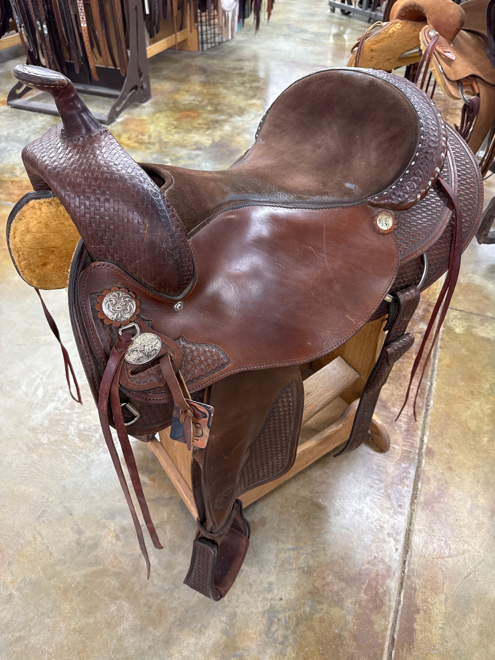 3/4 Tool Basket Stamp, Smoothout Leather, Chocolate Suede Padded Seat, Silver Laced Cantle, Saddle Strings, Tooled Leather Covered Stirrups