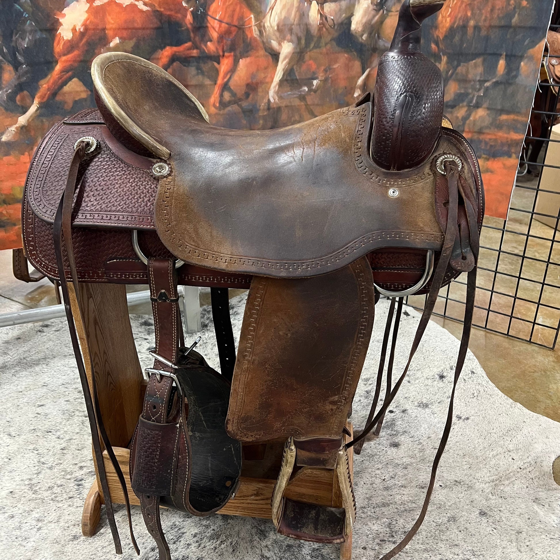 1/2 Tool Basket Stamp, Running W Border, Hard Seat, Roughout Seat/Jockey/Fender. Rawhide Pencil Roll, Saddle Strings, Rawhide Covered/Laced Stirrups