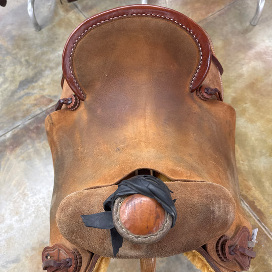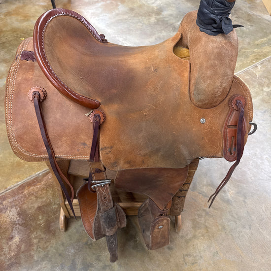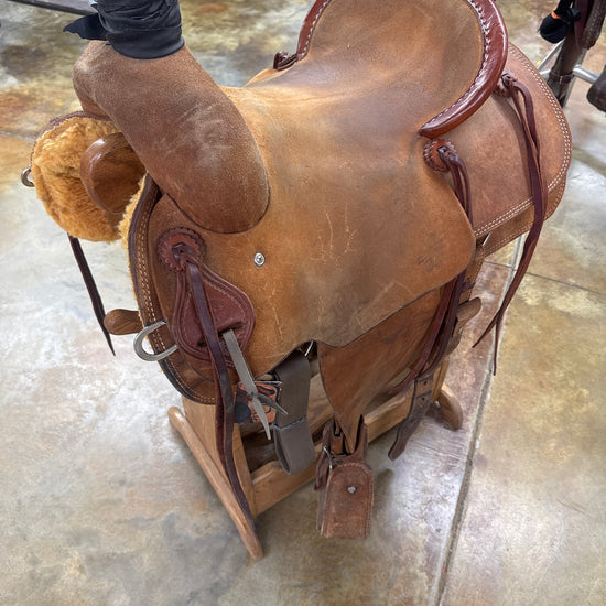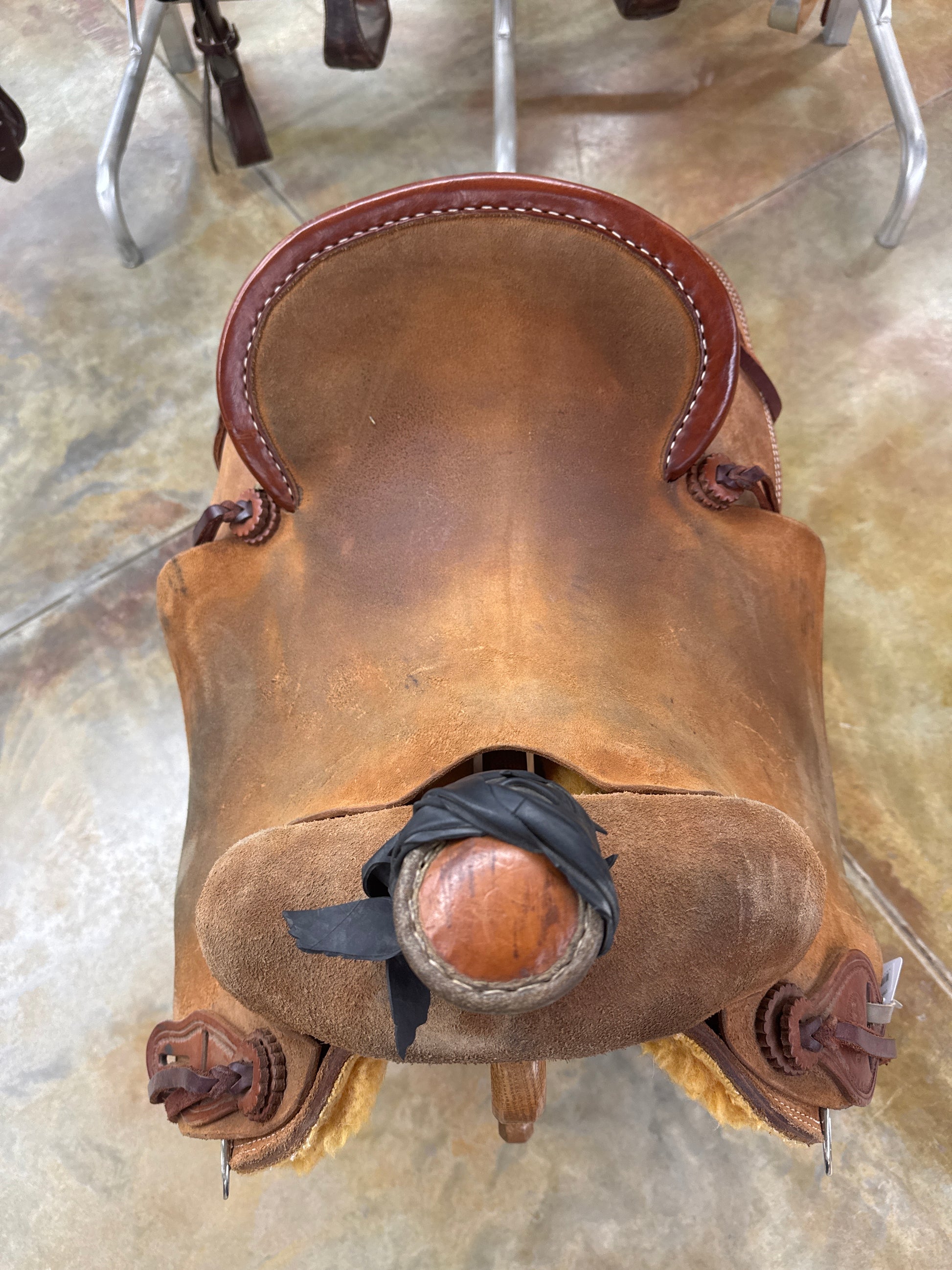 All Roughout, Hard Seat, Pencil Roll, Saddle Strings, Roughout Leather Covered Stirrups