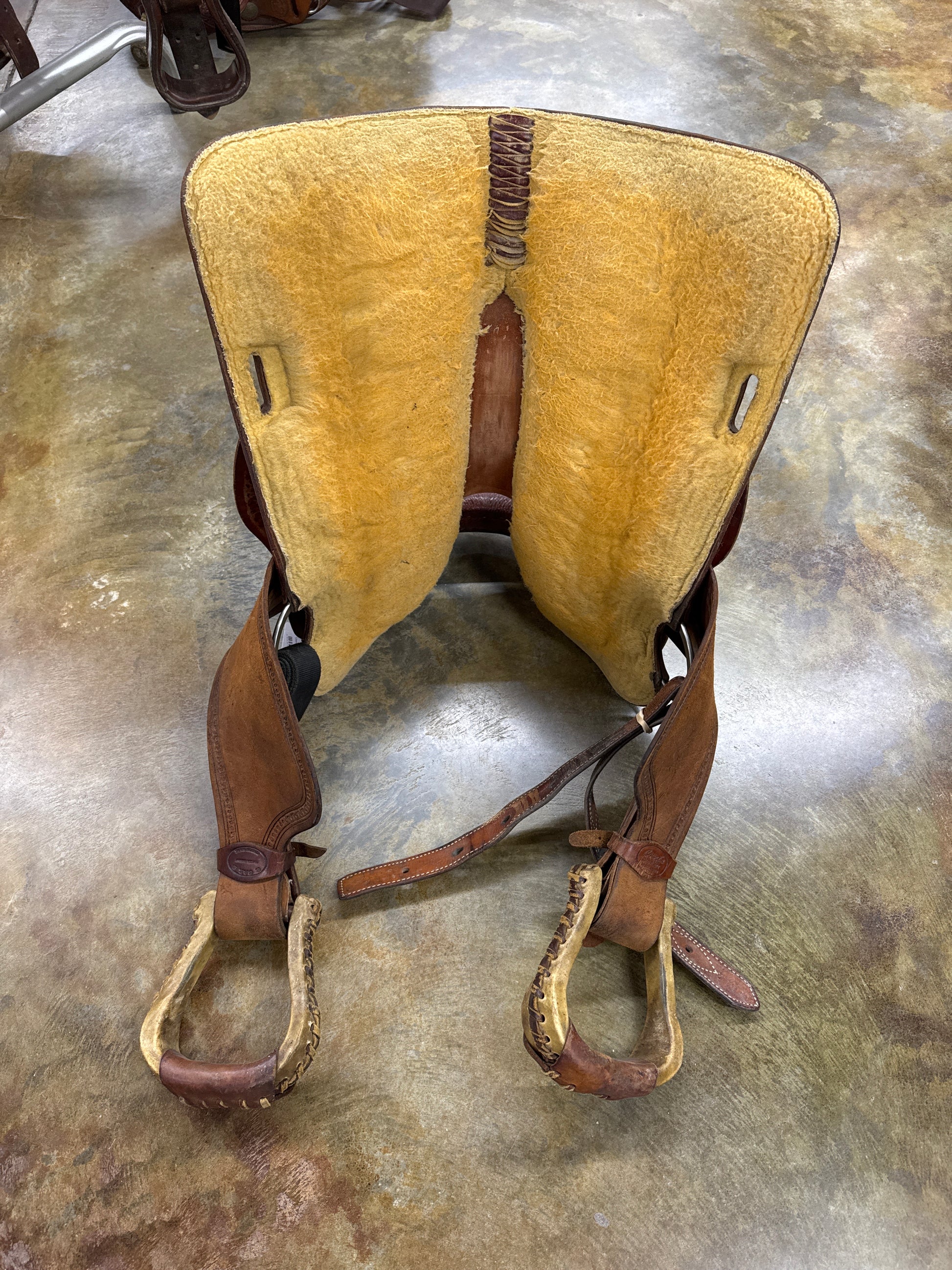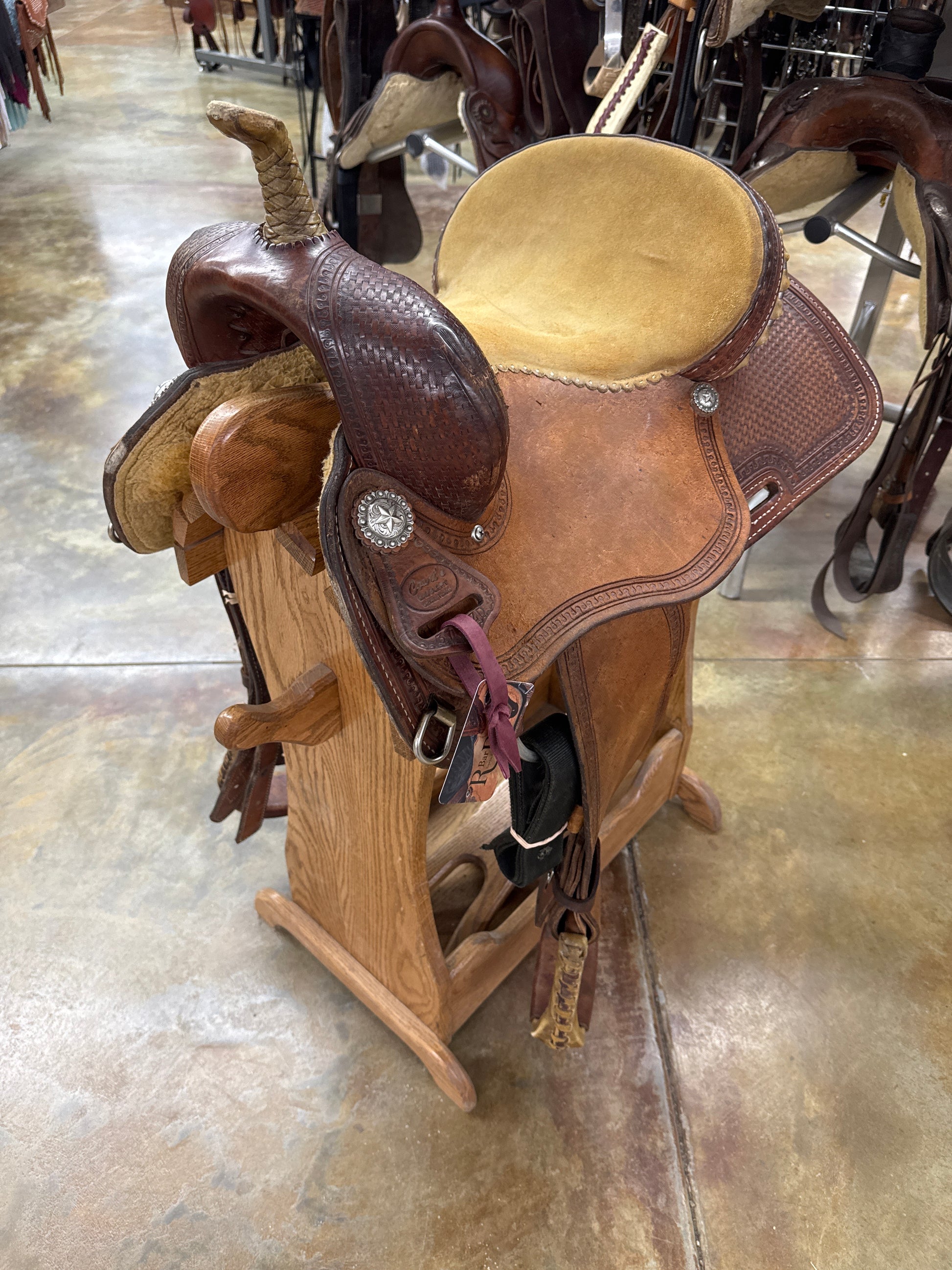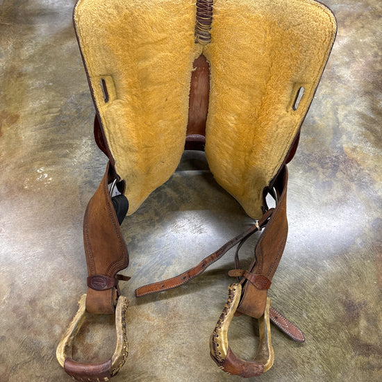1/2 Tool Basket Stamp, Running W Border, Roughout Jockey and Fender, Tan Suede Popstitched Seat, Rawhide Silver Laced Cantle, Rawhide Braided Horn, Rawhide Covered Stirrups