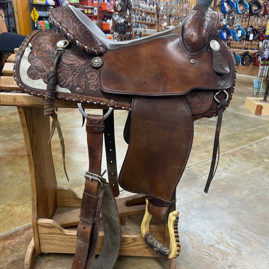 1/2 Tool Floral, Smoothout Leather, Brown Suede Seat, Silver Laced Skirts/Cantle/Swell, Silver Corners, Rawhide Covered Laced Stirrups