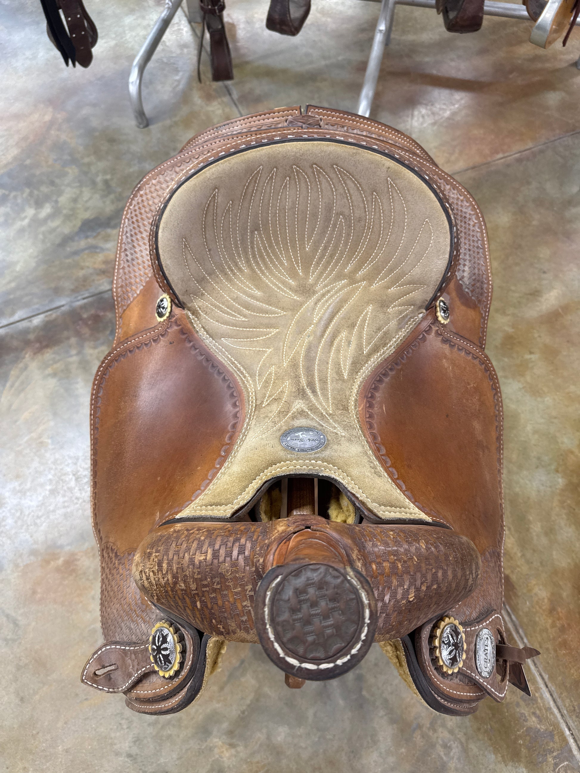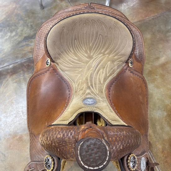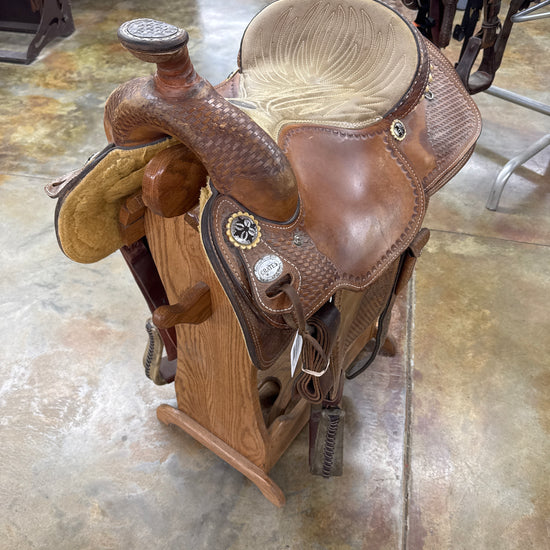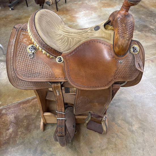 3/4 Tool Basket, Shell Border, Tan Suede/Stitched Seat, Rawhide Silver Laced Cantle, Rawhide Covered Laced Stirrups