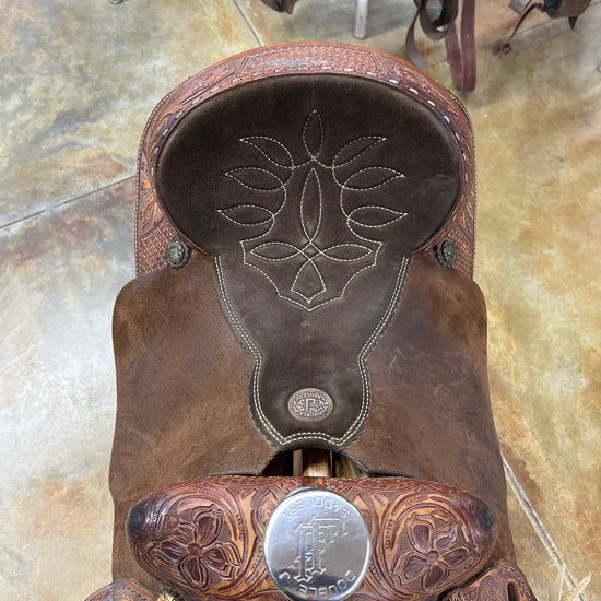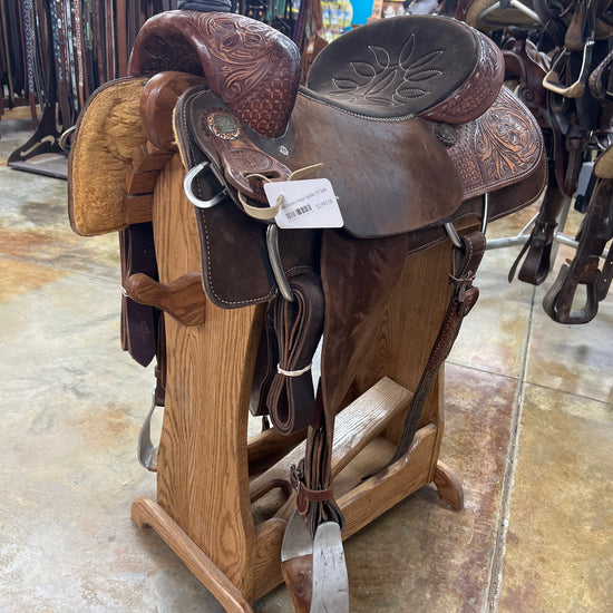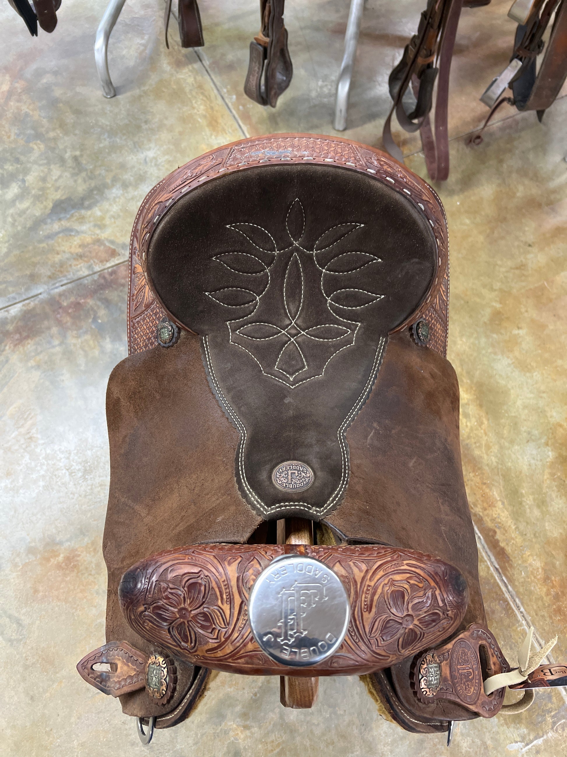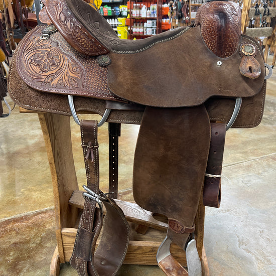 1/4 Tool Combo, Chocolate Leather, Roughout Jockey and Fender, Chocolate Suede Stitched Seat, High Tech Horn, Aluminum Slanted StirrupsĀ